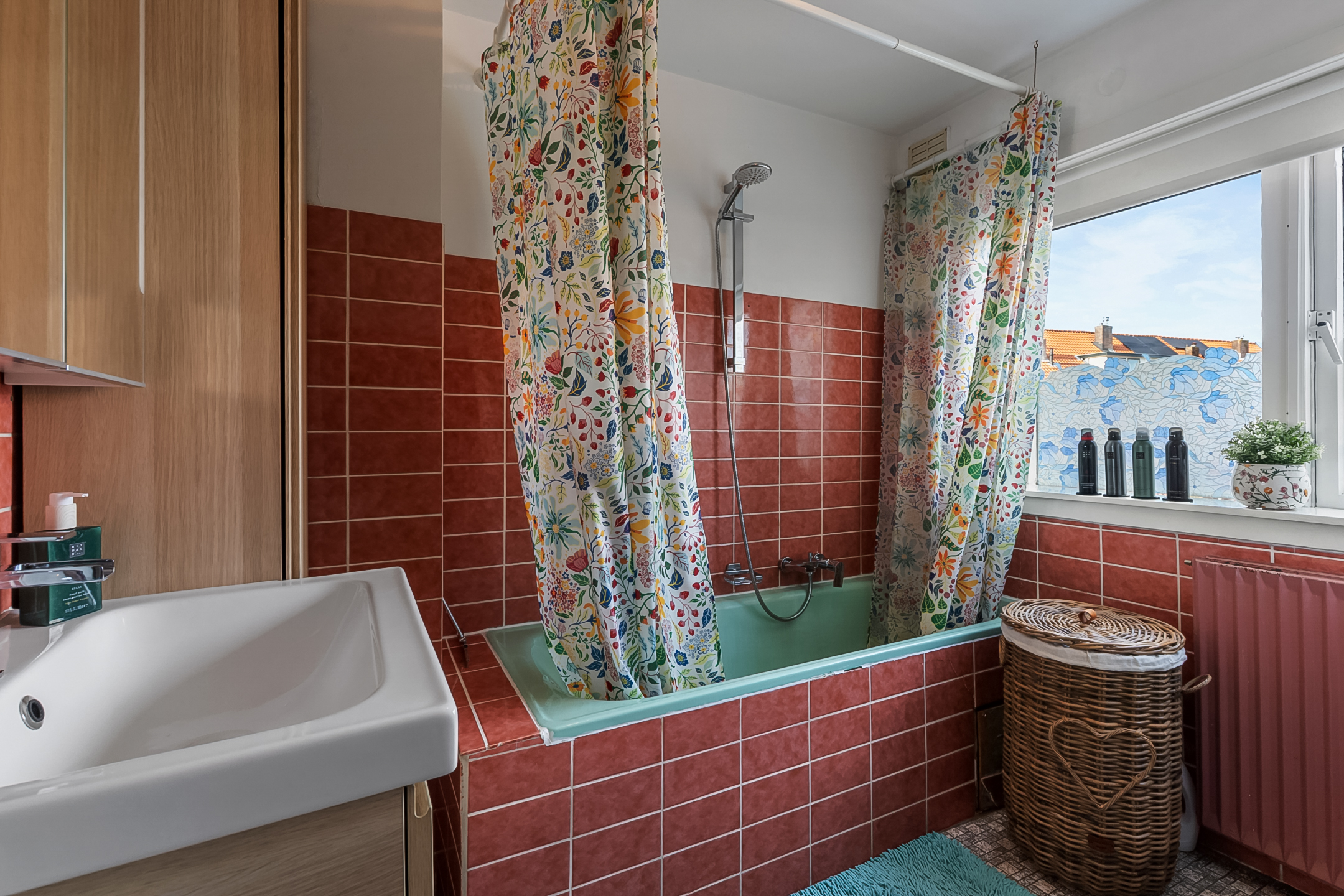 1e verdieping: ruime overloop, ruime hoofdslaapkamer over de volle breedte aan de voorzijde, 2e ruime slaapkamer met een inbouwkast en een badkamer met ligbad, wastafel en wasmachine-aansluiting.