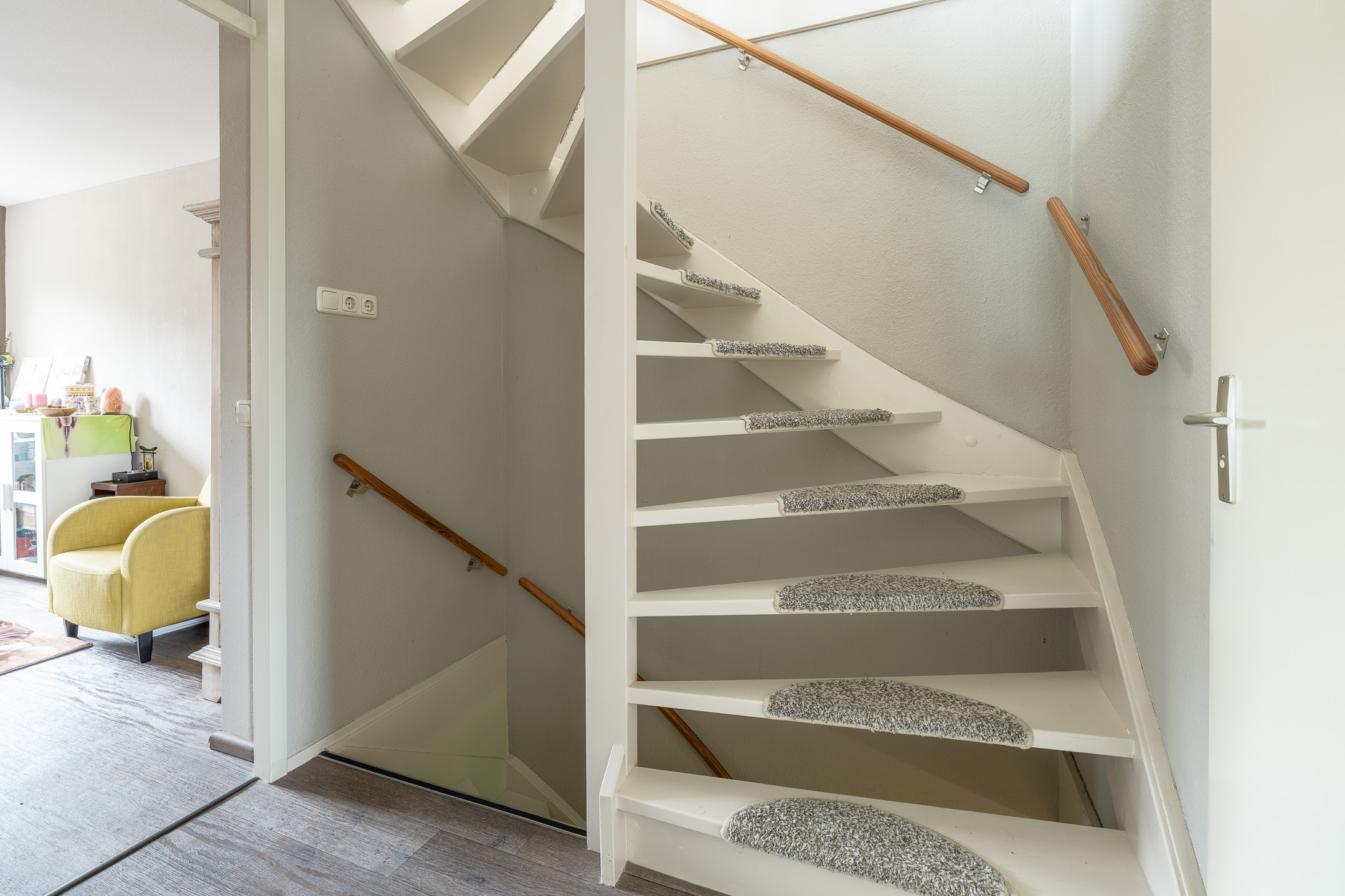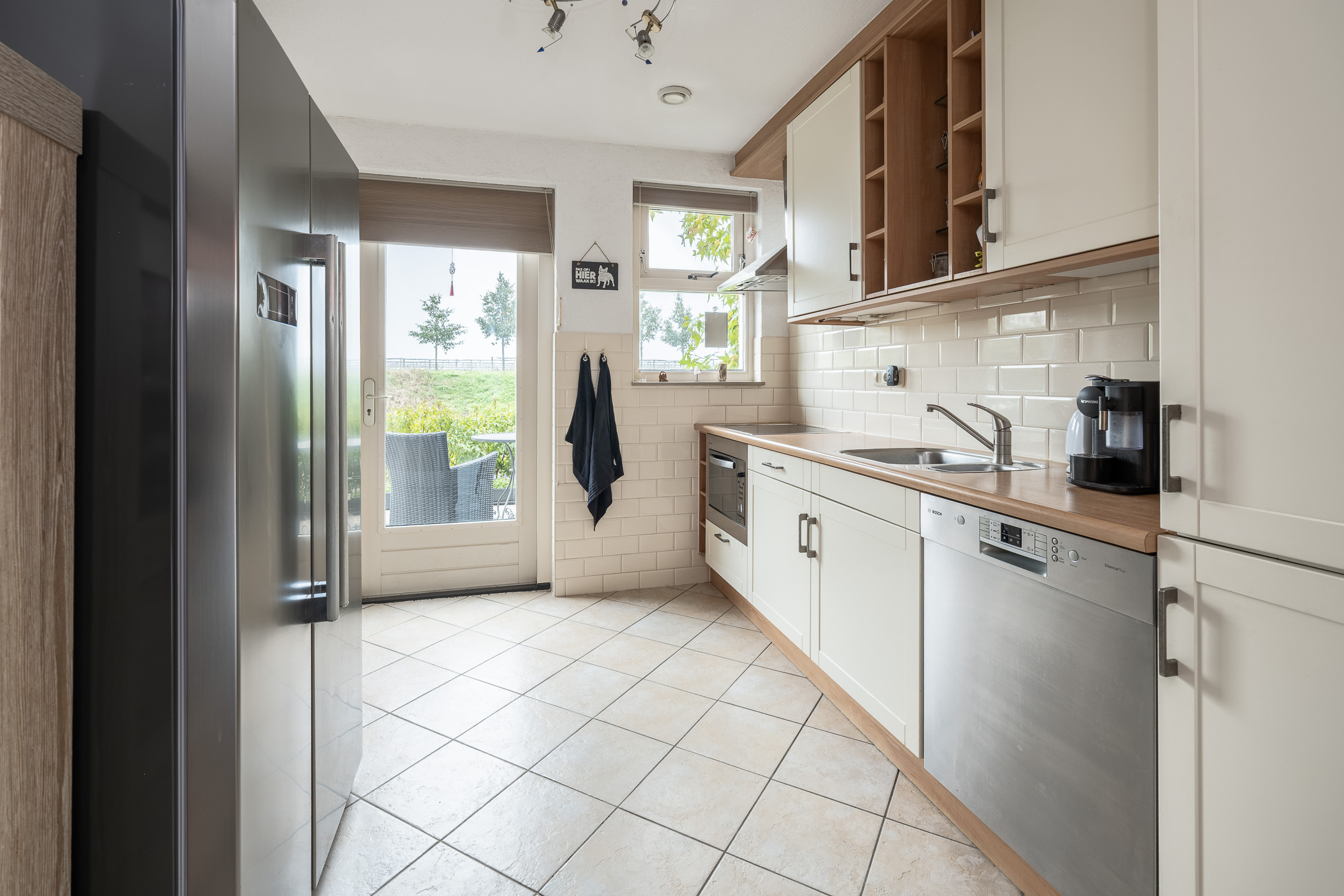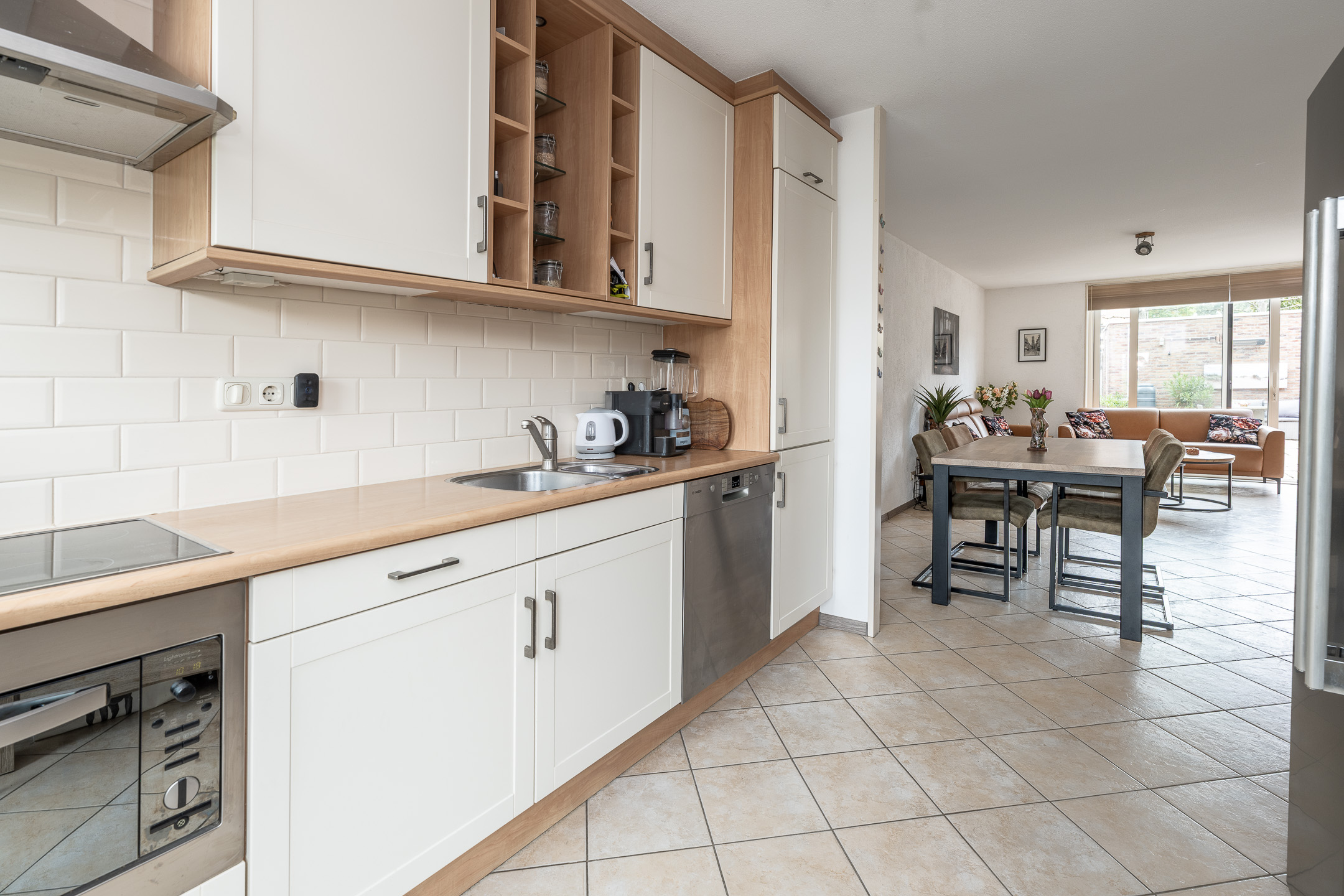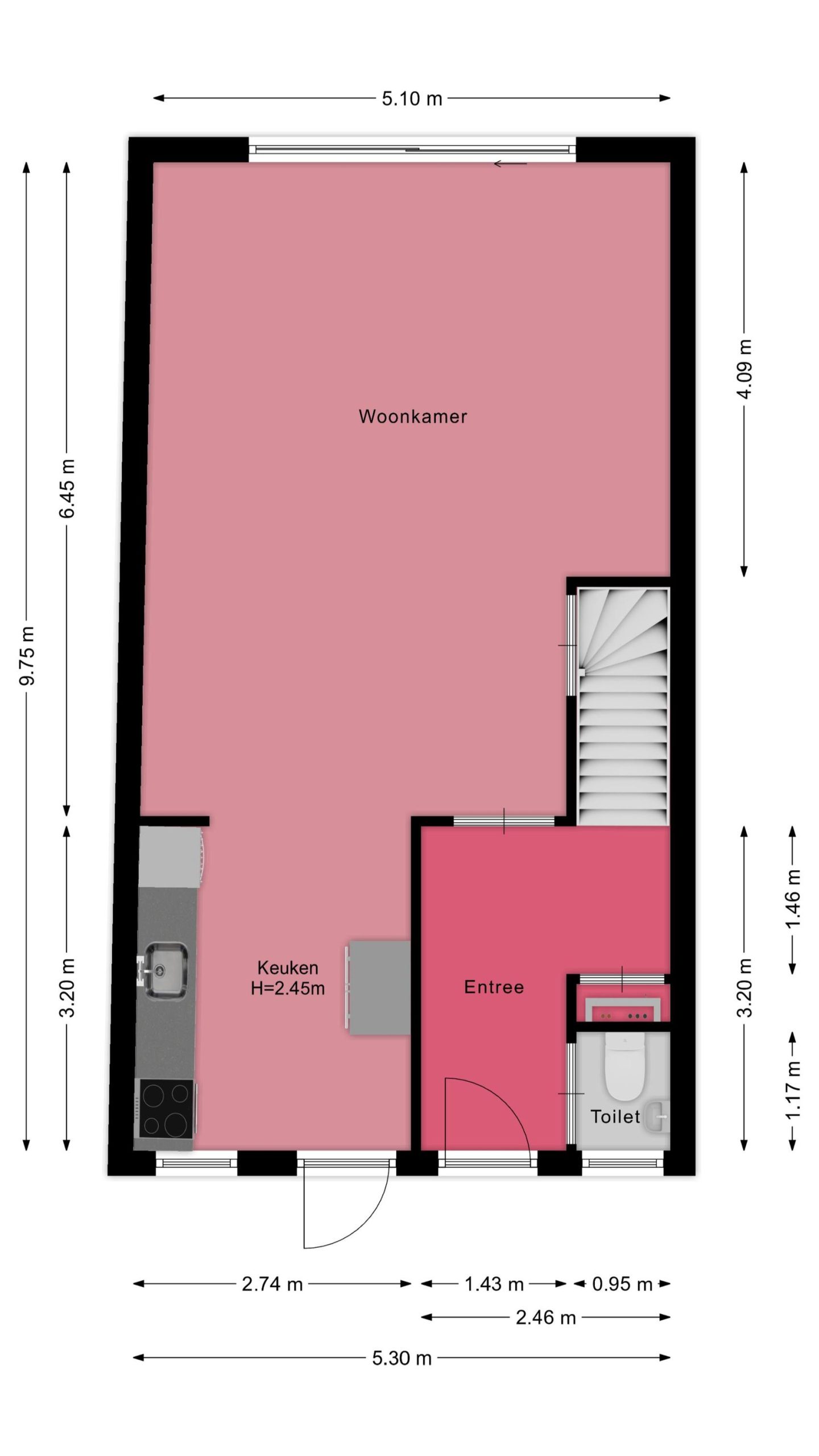 Begane grond: entree, hal met toegang tot toilet en meterkast, royale woonkamer over de volle breedte van de woning met praktische trapkast, een ruime schuifpui naar de achtertuin, een open keuken met diverse inbouwapparatuur en een deur naar het zonneterras in de voortuin.