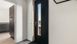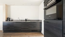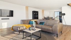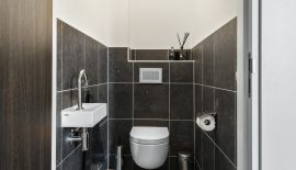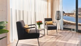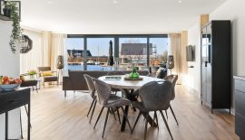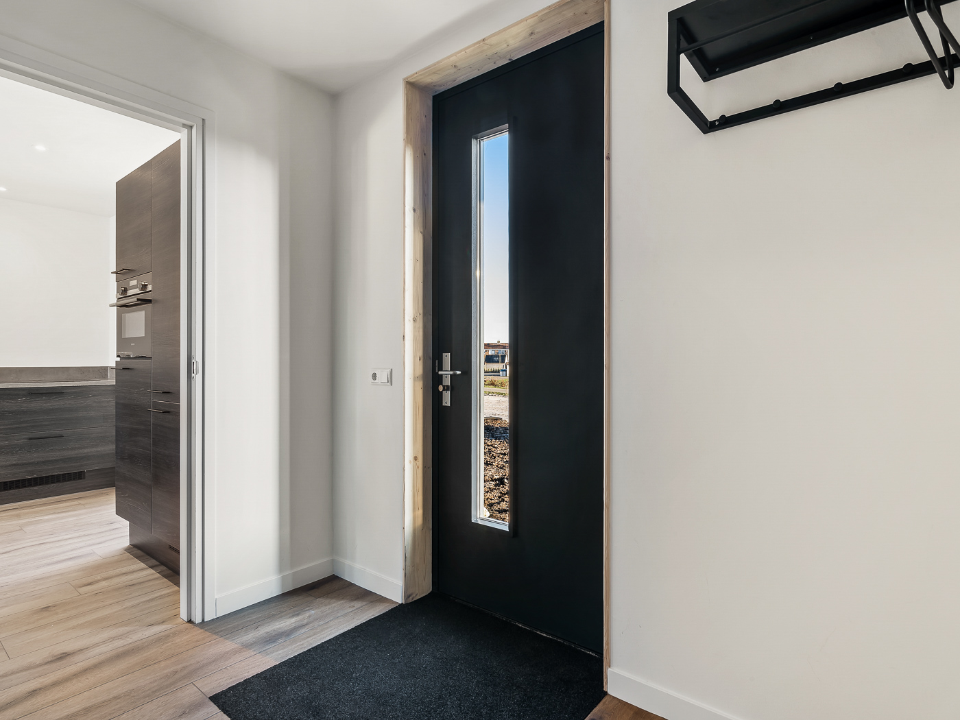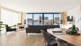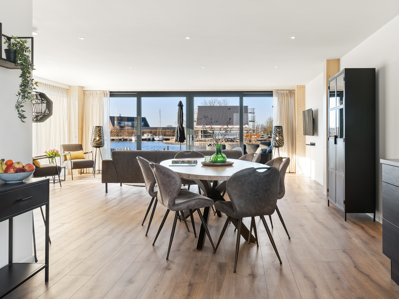 Entree / hal, meterkast en luxe hangend toilet met fonteintje. Royale zonnige L-vormige living bestaande uit een riante zithoek met grote glaspuien / schuifpui naar de diepe achtertuin met eigen aanlegsteiger. Van hieruit geniet u volop van het zicht op de haven en de toegang naar het open water. Aan de voorzijde is een fraai zwartkleurige keuken met eethoek geplaatst en inbouwapparatuur zoals een inductiekookplaat, koel-/vrieskast, vaatwasser en combi-magnetron. In de hal bevindt zich een inpandige berging met lucht-water warmtepomp i.c.m. boiler en vloerverwarming.
