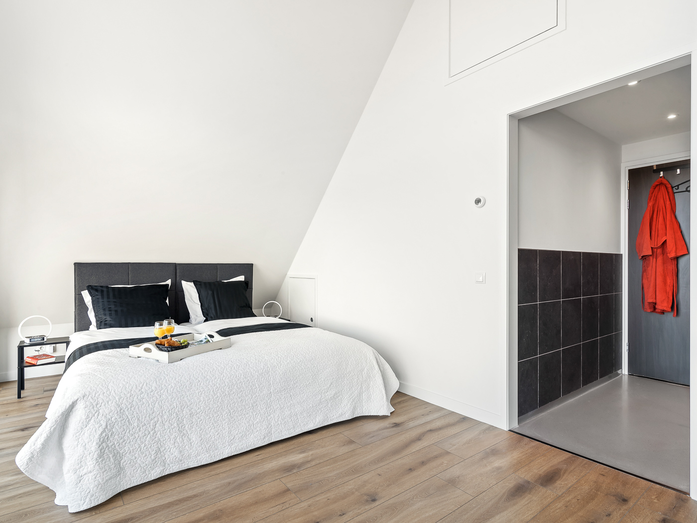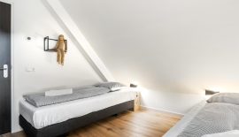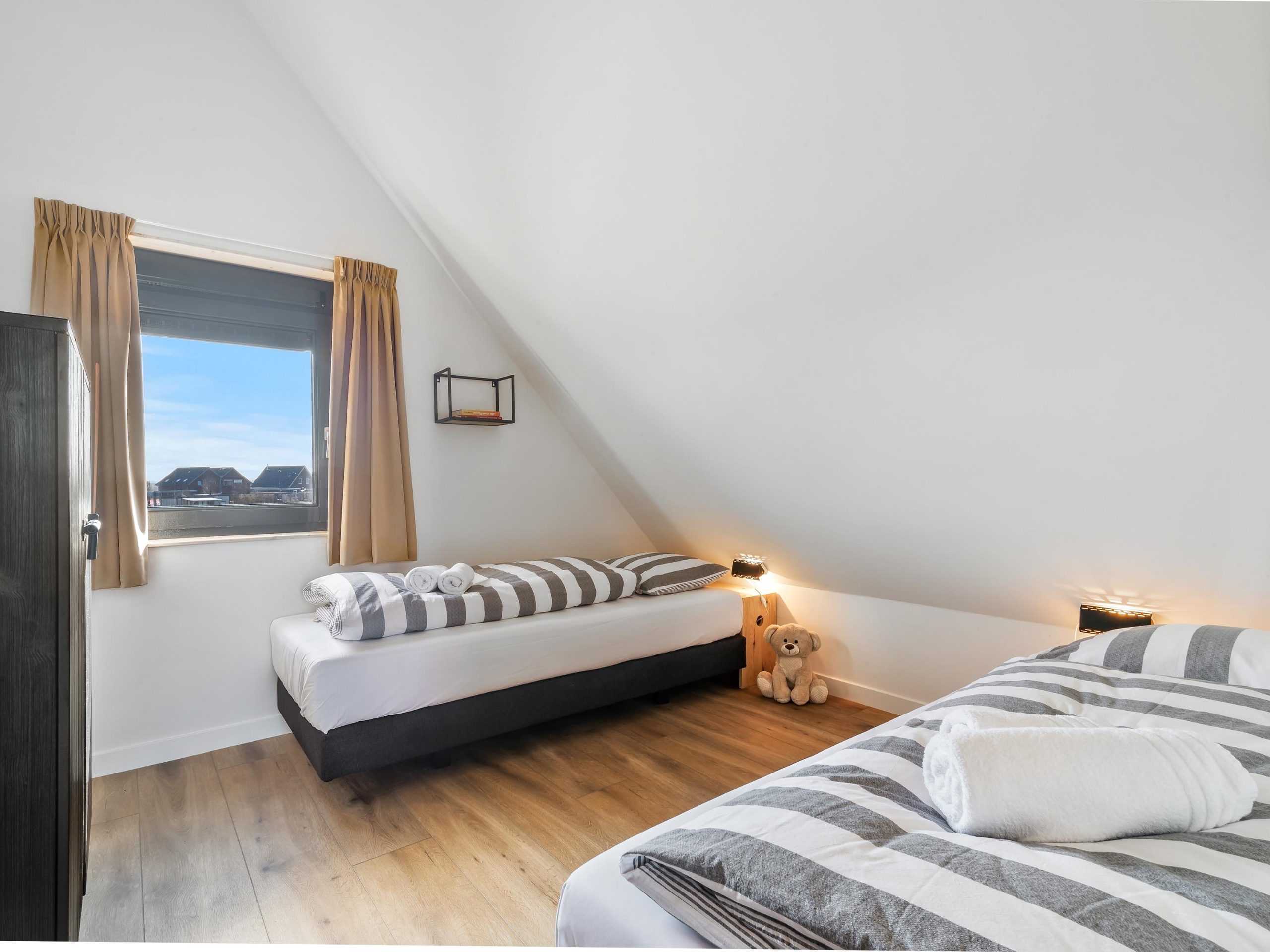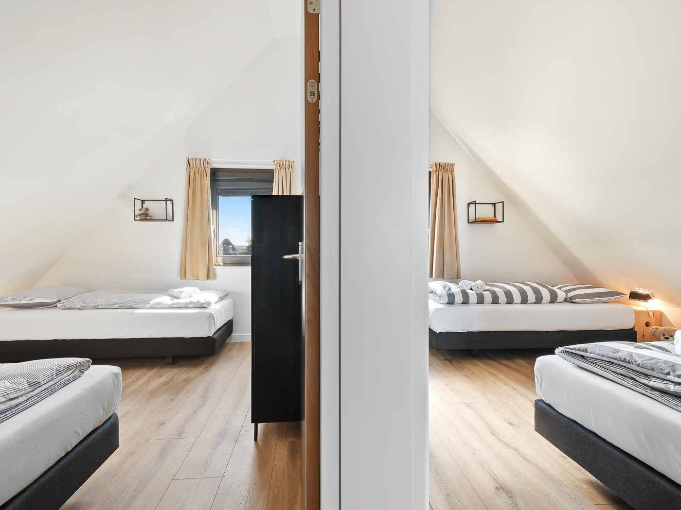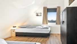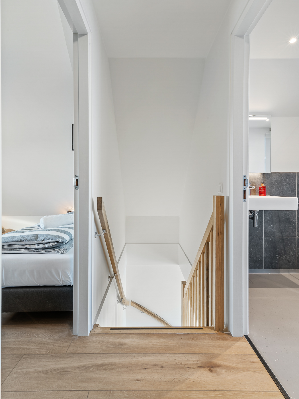 Overloop met luxe hangend toilet en fonteintje. Riante hoofdslaapkamer met grote driehoekige glaspui met openslaande deuren en een Frans balkon waar vanuit u een panoramisch uitzicht heeft op het water. Deze master-bedroom beschikt over een eigen inloopdouche met wastafel. Ook is een grote kofferberging aanwezig, waar u bijvoorbeeld ook uw privéspullen kunt opbergen. Aan de voorzijde bevinden zich nog 2 slaapkamers, beide met gevelraam. Een 2e luxe badkamer met inloopdouche, glaswand, wastafelmeubel en tuimelraam maken het geheel compleet.