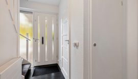 Overdekte entree / hal met zwevend toilet, trapkast en garderobenis. Royale zonnige L-vormige woonkamer met eiken vloerdelen, daglicht aan drie zijden en openslaande deuren naar de zonnige achtertuin. Aan de achterzijde bevindt zich een moderne hoekkeuken met composiet blad en inbouwapparatuur zoals een 5-pits kookplaat, afzuigkap, oven, vaatwasser en een close-in-boiler.