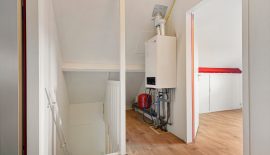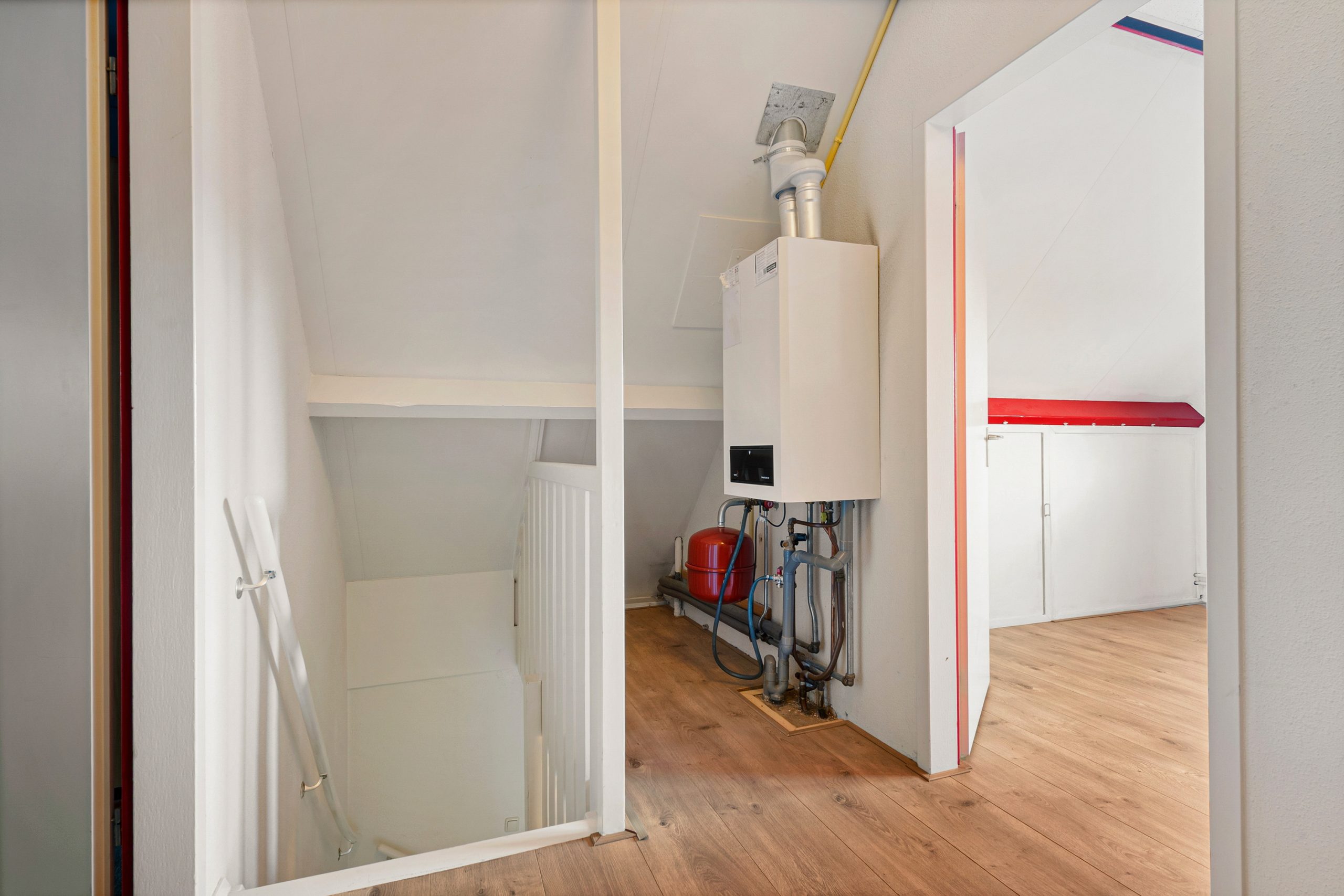Overloop met opstelling Nefit-combiketel, 2 omvormers en berging. Zowel aan de voor- als achterzijde ligt een grote slaapkamer, beide met nieuw kunststof gevelraam (2023), radiator en veel bergruimte. De kamer aan de voorzijde is in 2023 ook nog voorzien van een airco-installatie (verwarmen en koelen).