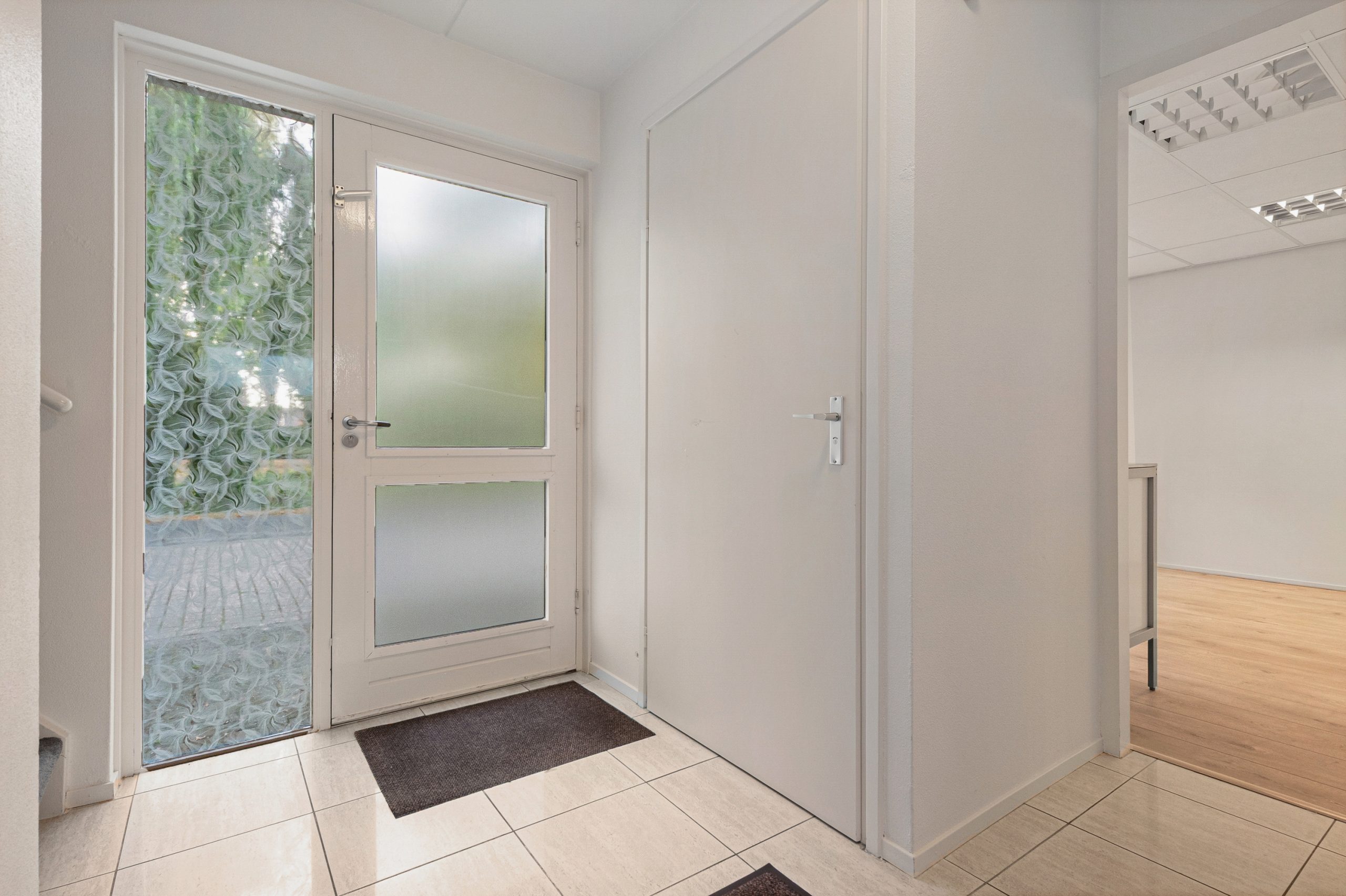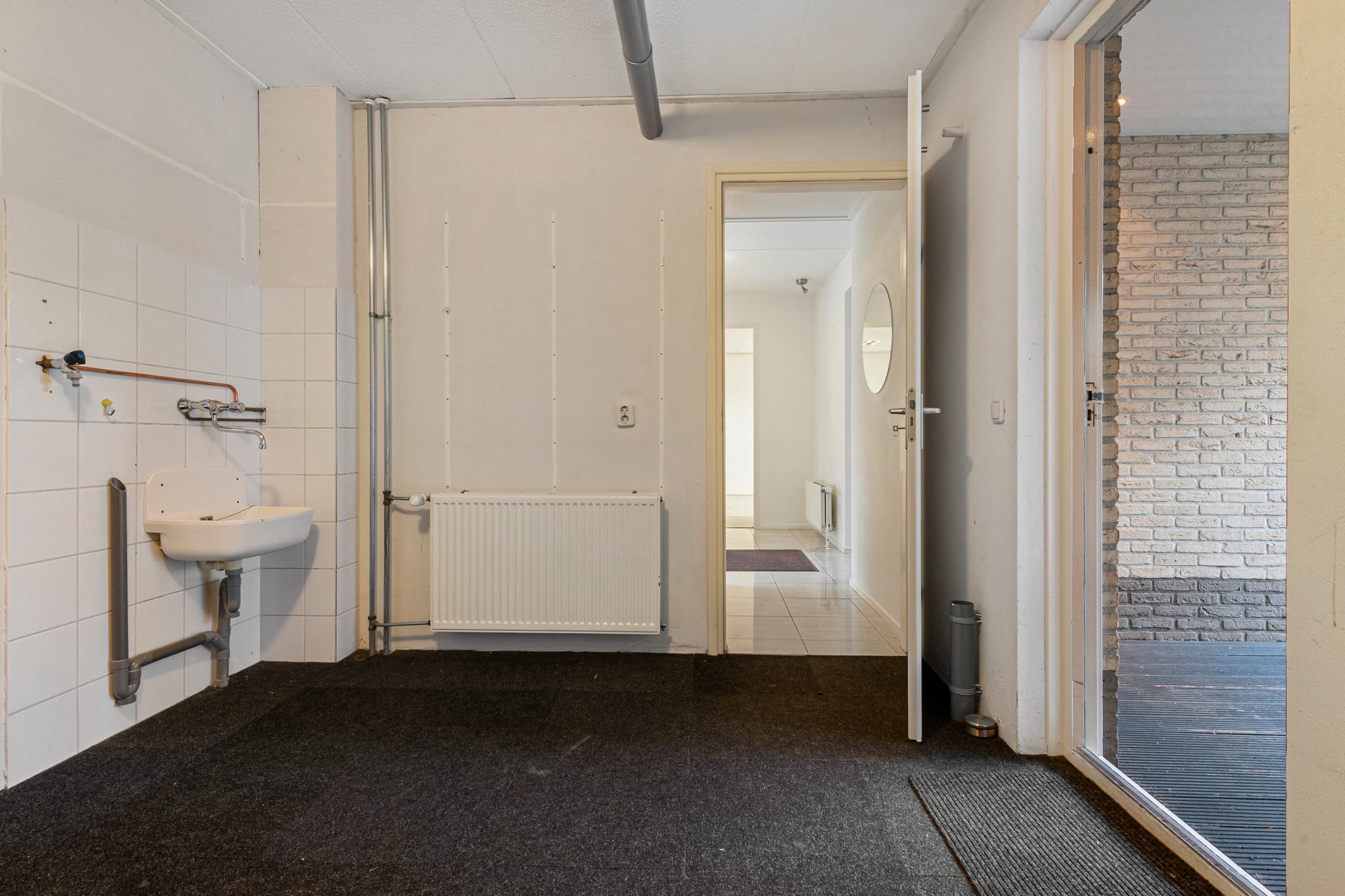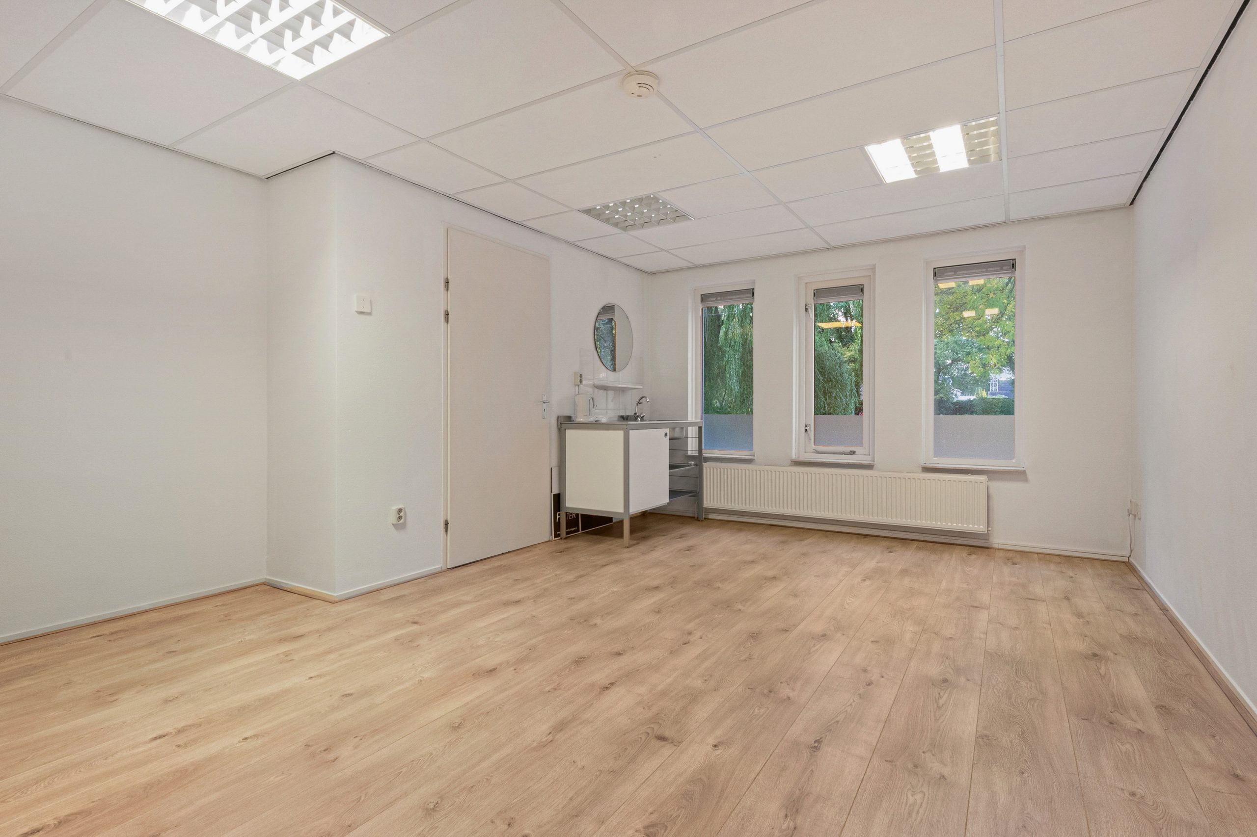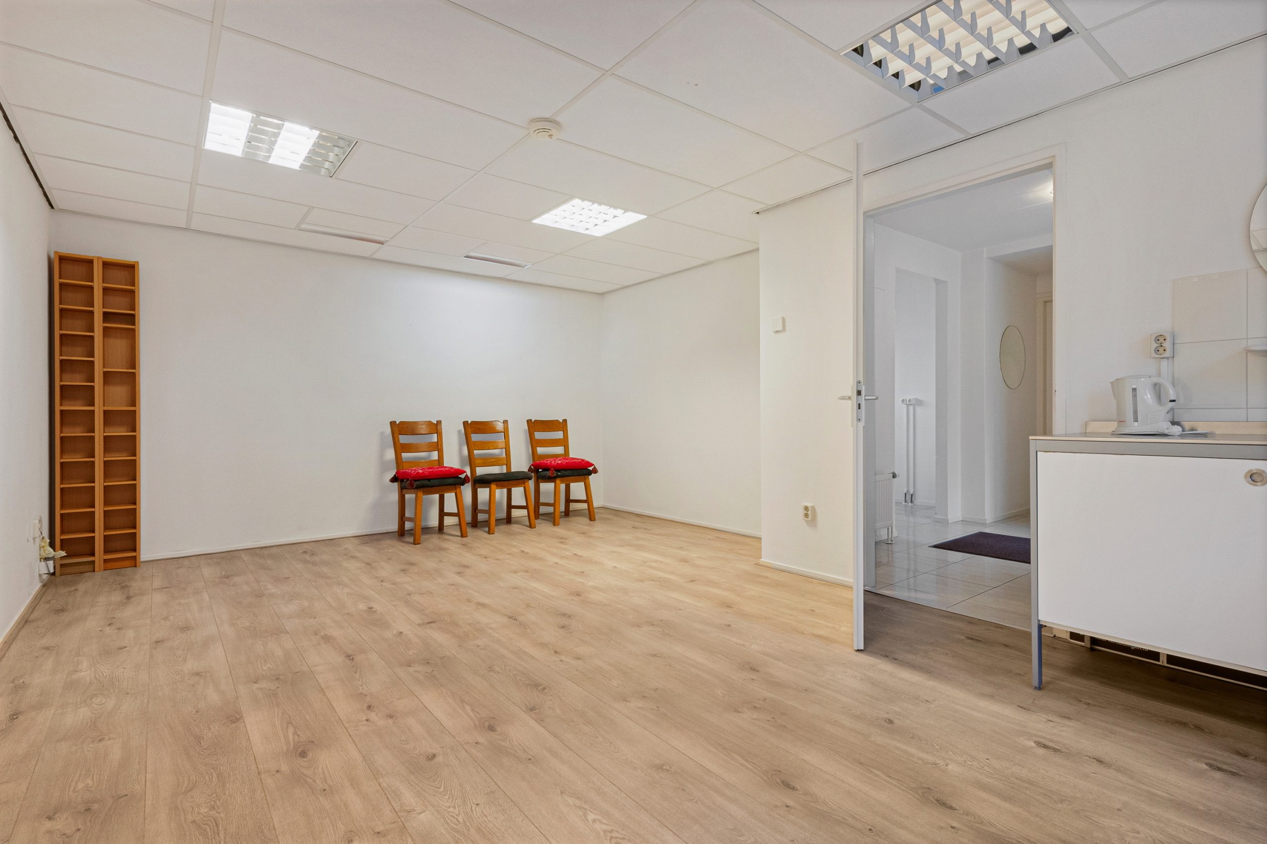 Vanaf de zijstraat (Kalmoes) bereik je de 2e entree met hal met trapkast, trapopgang, zwevend toilet en een open wachtkamer met gevelraam. Hier bevindt zich nu de was- en droogaansluiting. Naast de hal ligt een grote L-vormige praktijkkamer met meerdere gevelramen, systeemplafond met verlichting en een kitchenette met warm en koud water.