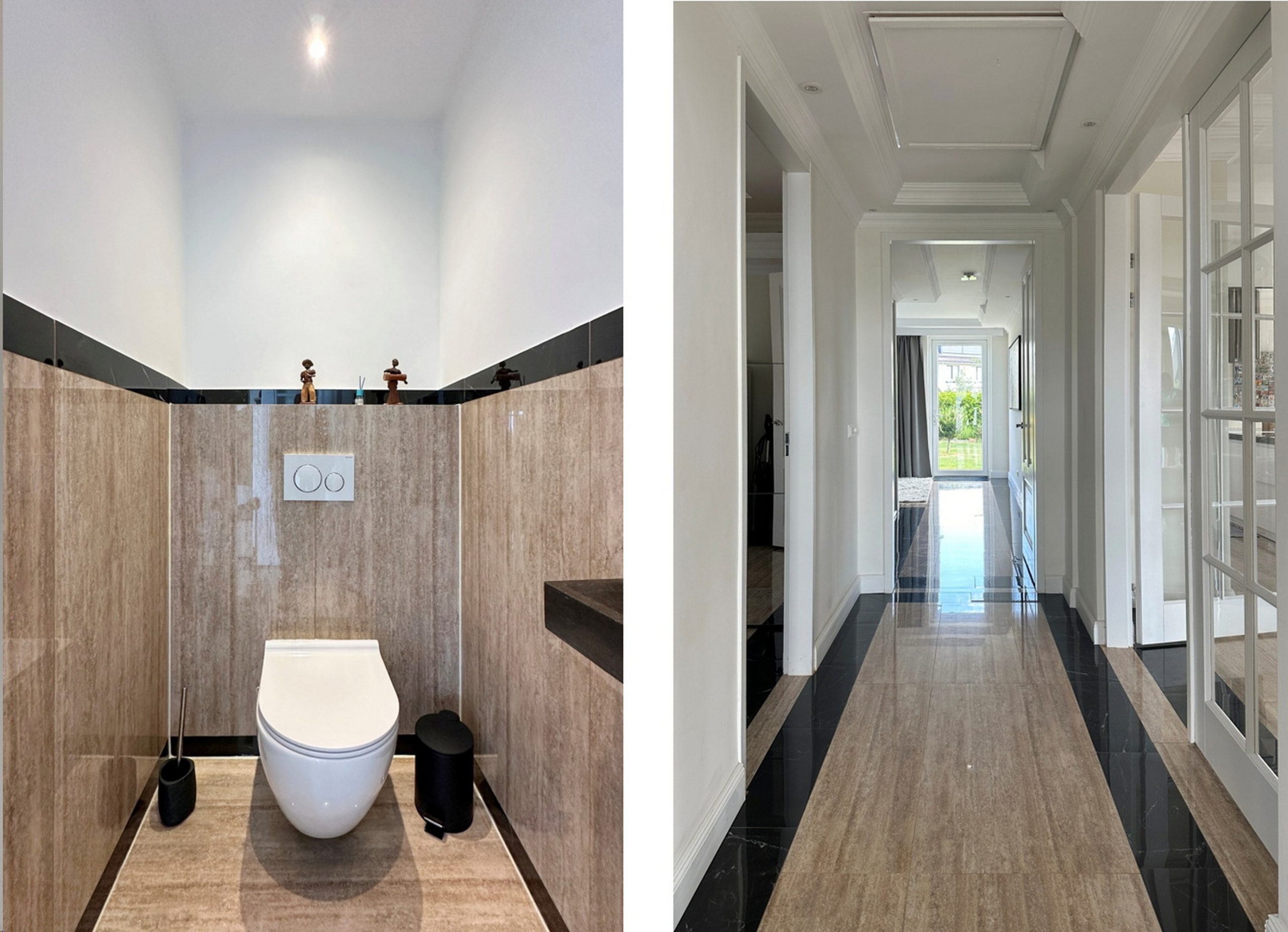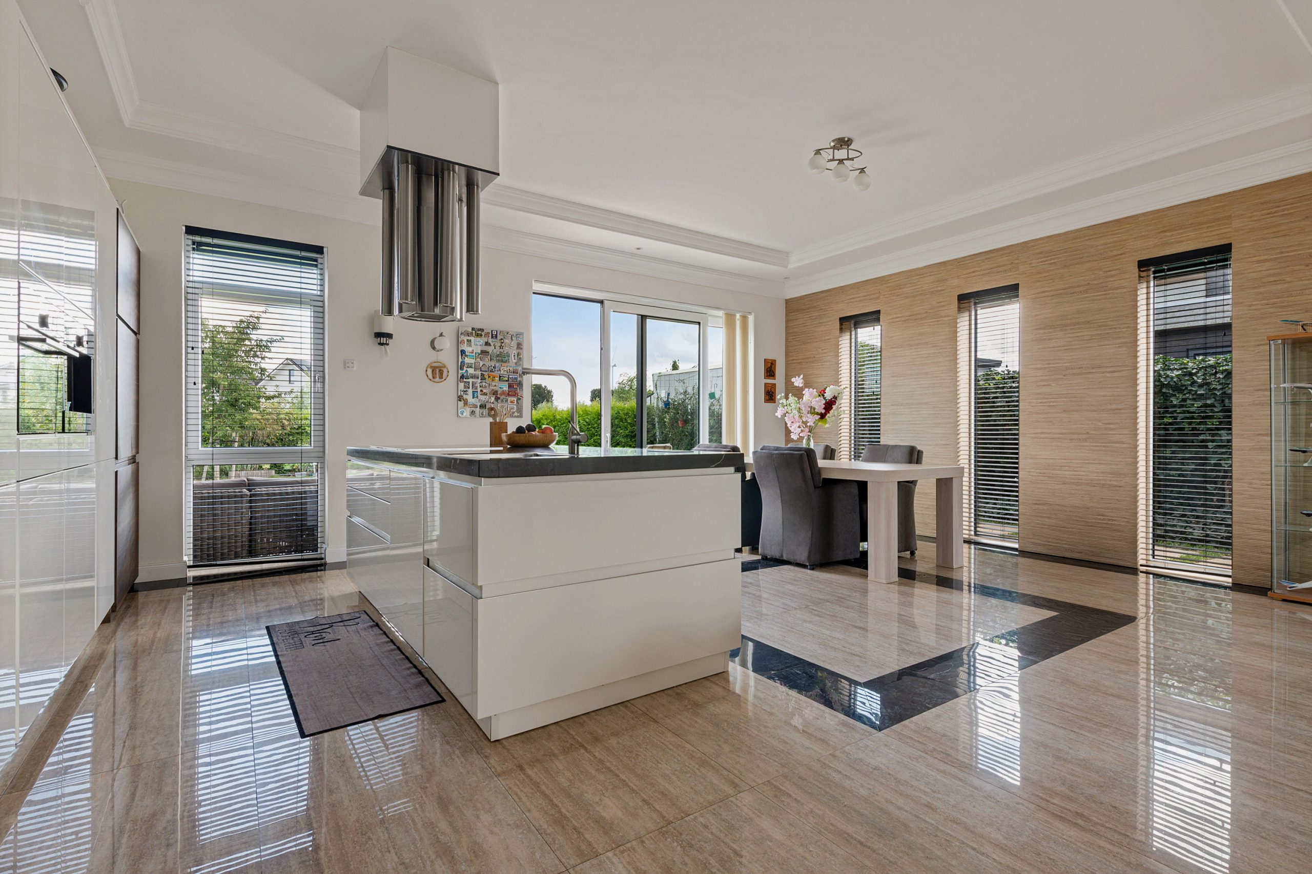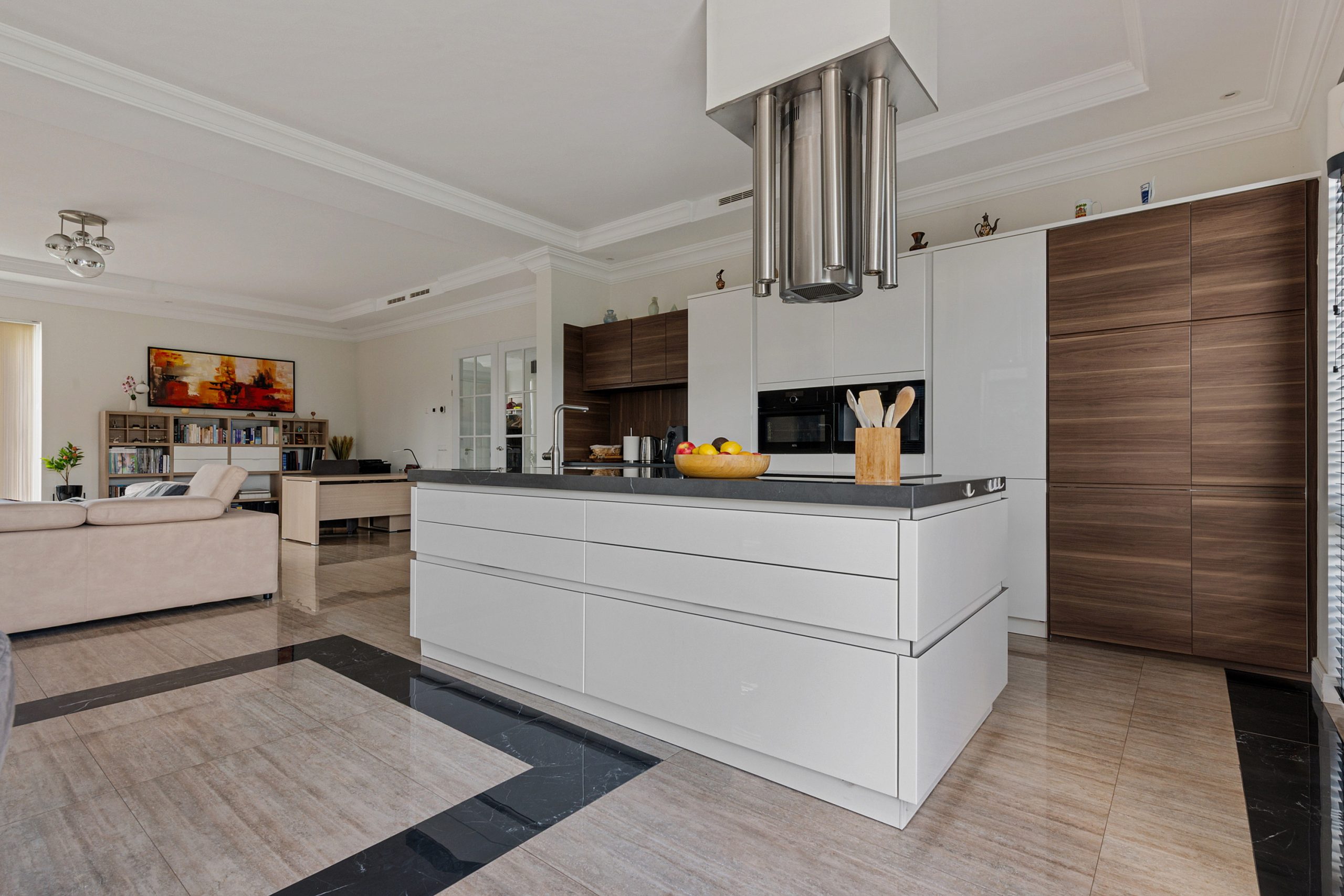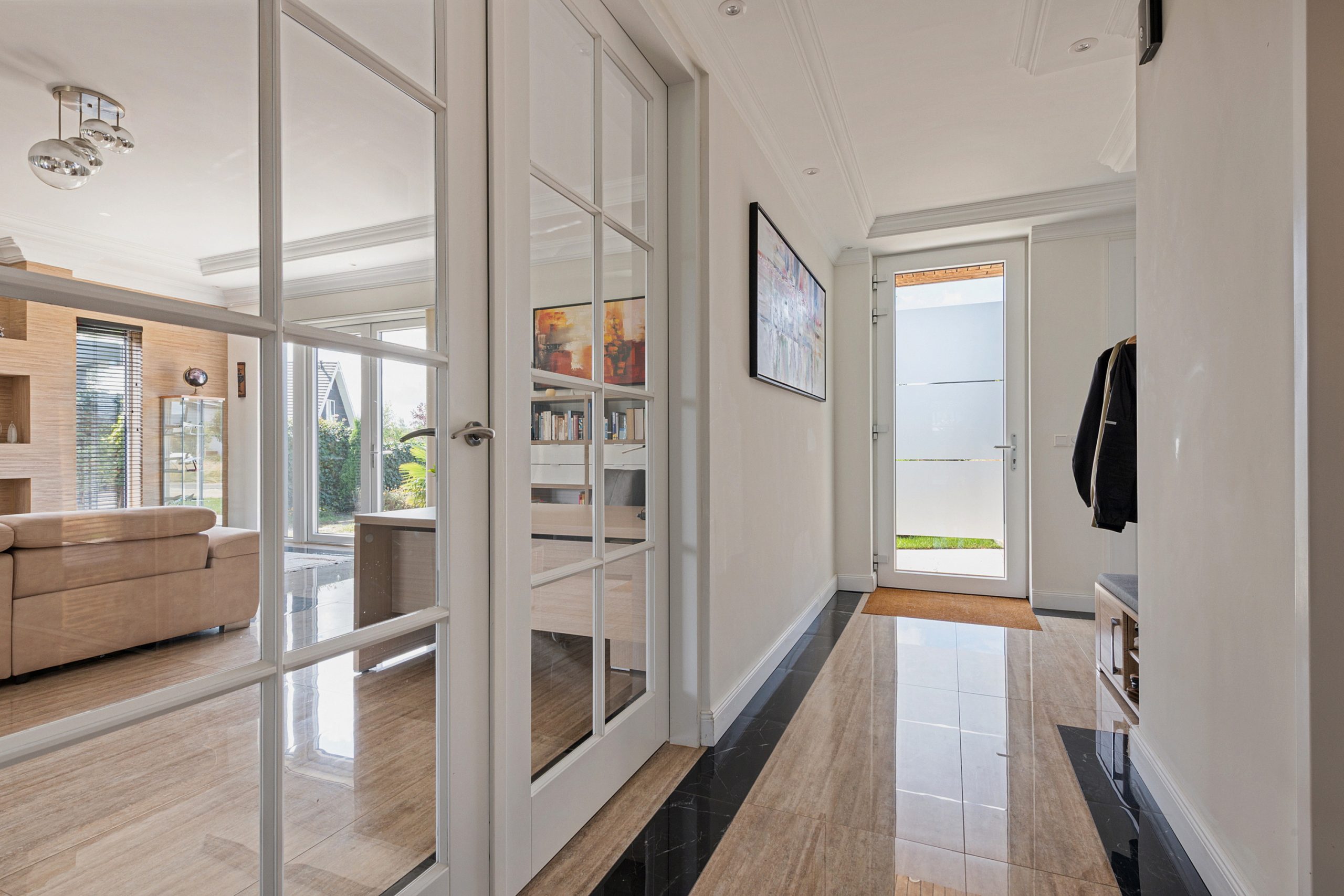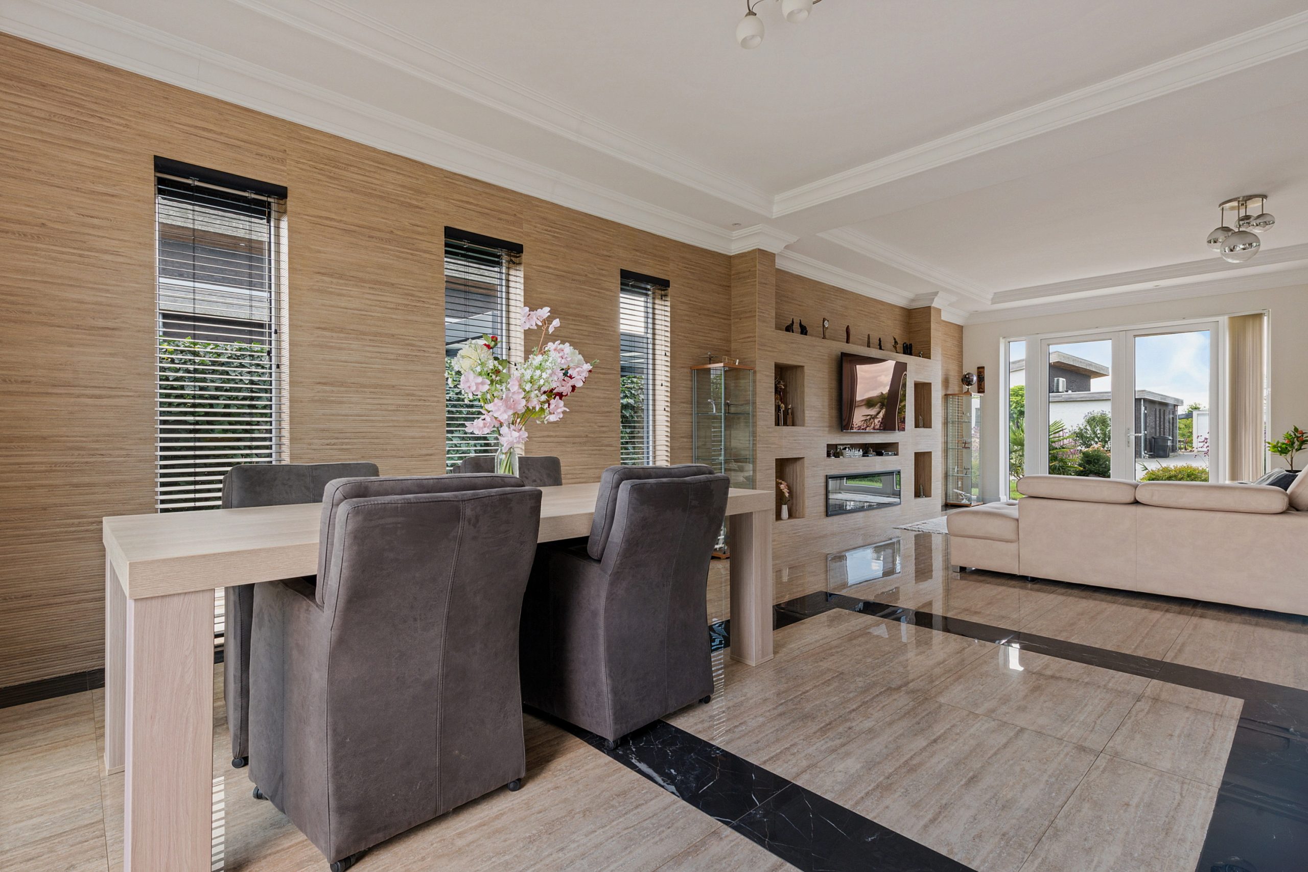 Diepe voortuin met parkeergelegenheid en entree. Ruime hal met paneeldeuren en een luxe hangend toilet. Dubbele deuren geven toegang tot de prachtige zitkamer aan de voorzijde van de woning. Deze doet vriendelijk aan en is voorzien van veel raampartijen, een fraai stuukplafond en een unieke wandafwerking met TV en elektrische haard. Op de vloer liggen exclusieve plavuizen in marmer look en (uiteraard) voorzien van vloerverwarming. De luxe woonkeuken is uitgerust met grote kastenwand en kookeiland. Aan de uitstraling is veel aandacht besteed en de koffiebar geeft een exclusieve indruk. De keuken beschikt verder over een koelkast, vriezer, vaatwasser, oven, koffiemachine en inductie kookplaat. Er is volop ruimte voor een grote eettafel en de schuifpui geeft directe toegang tot de riante achtertuin.