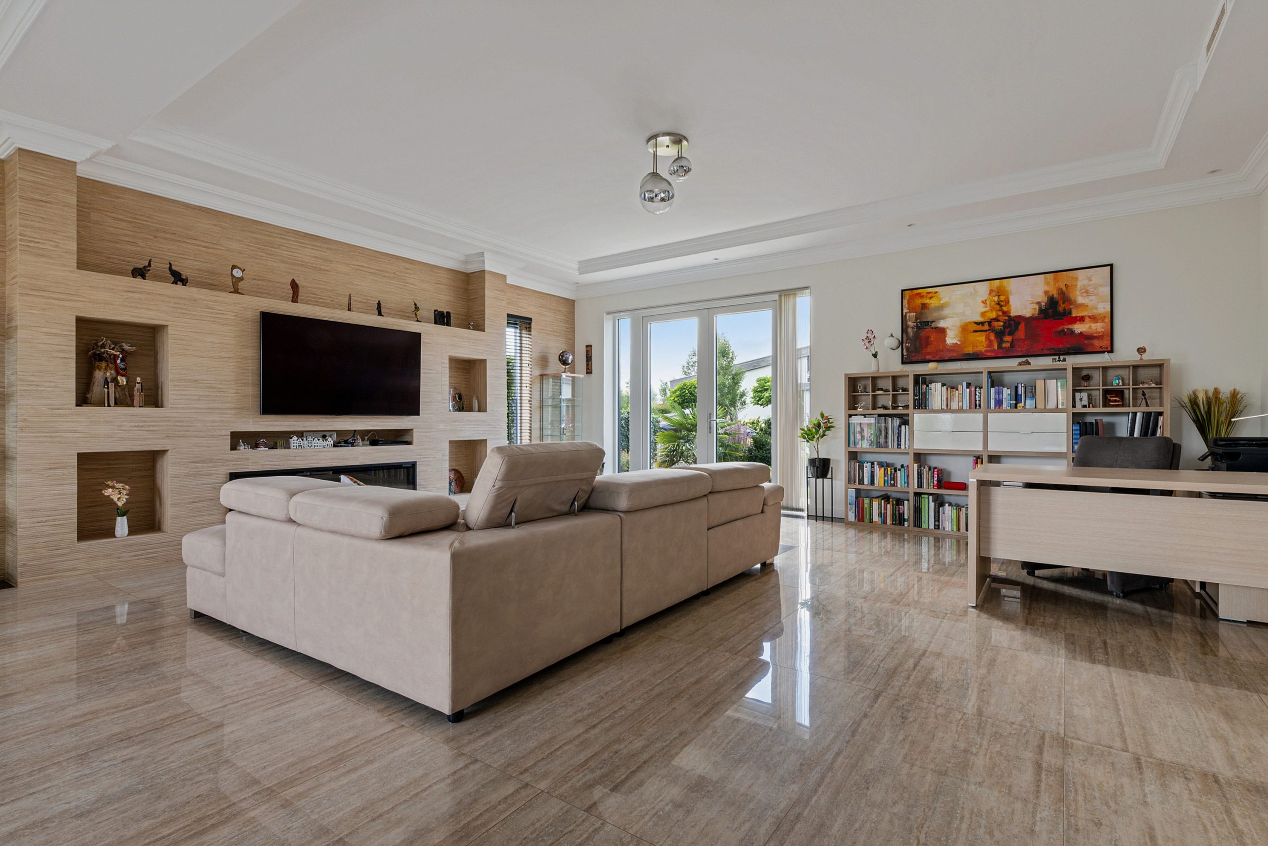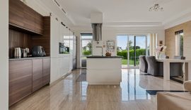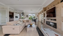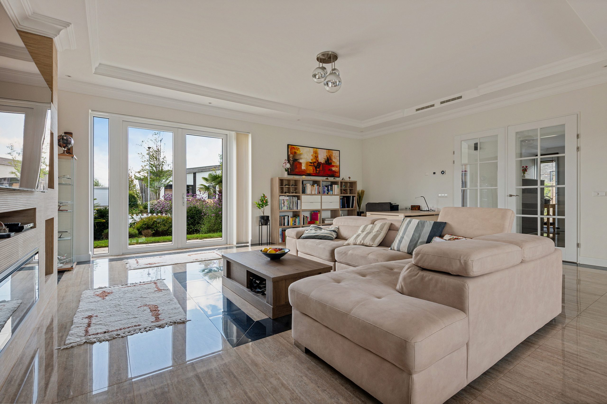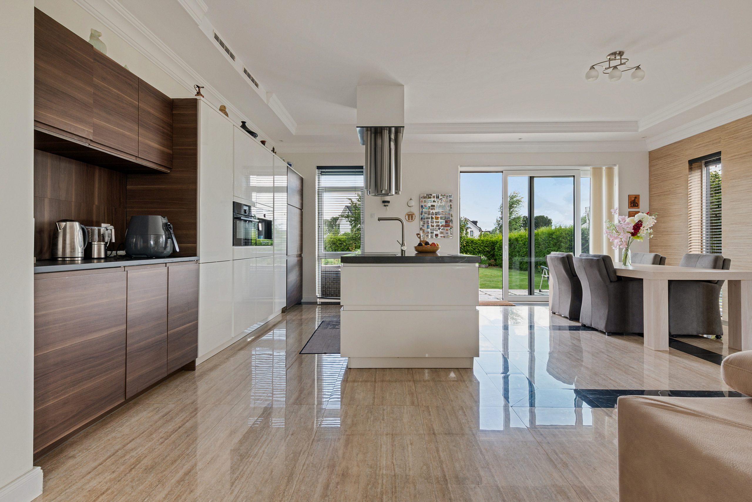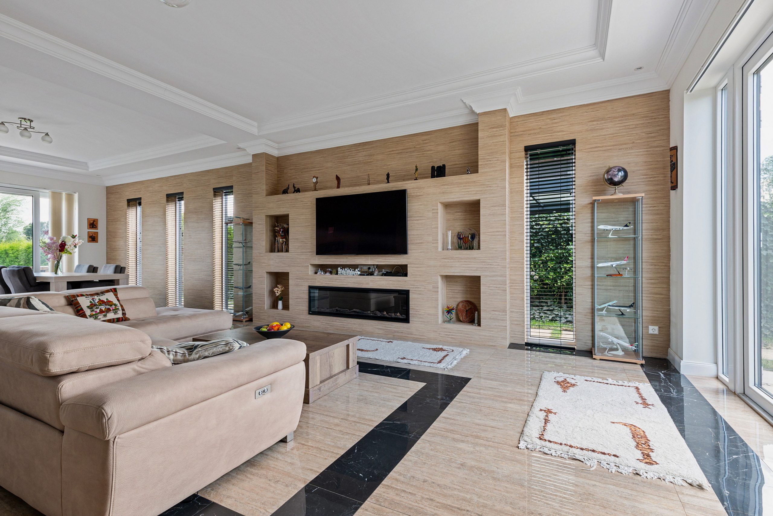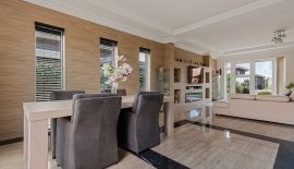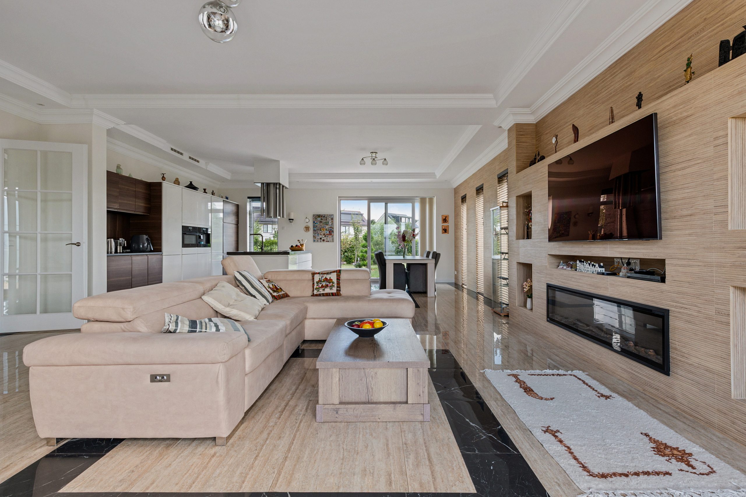 Diepe voortuin met parkeergelegenheid en entree. Ruime hal met paneeldeuren en een luxe hangend toilet. Dubbele deuren geven toegang tot de prachtige zitkamer aan de voorzijde van de woning. Deze doet vriendelijk aan en is voorzien van veel raampartijen, een fraai stuukplafond en een unieke wandafwerking met TV en elektrische haard. Op de vloer liggen exclusieve plavuizen in marmer look en (uiteraard) voorzien van vloerverwarming. De luxe woonkeuken is uitgerust met grote kastenwand en kookeiland. Aan de uitstraling is veel aandacht besteed en de koffiebar geeft een exclusieve indruk. De keuken beschikt verder over een koelkast, vriezer, vaatwasser, oven, koffiemachine en inductie kookplaat. Er is volop ruimte voor een grote eettafel en de schuifpui geeft directe toegang tot de riante achtertuin.