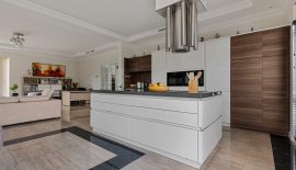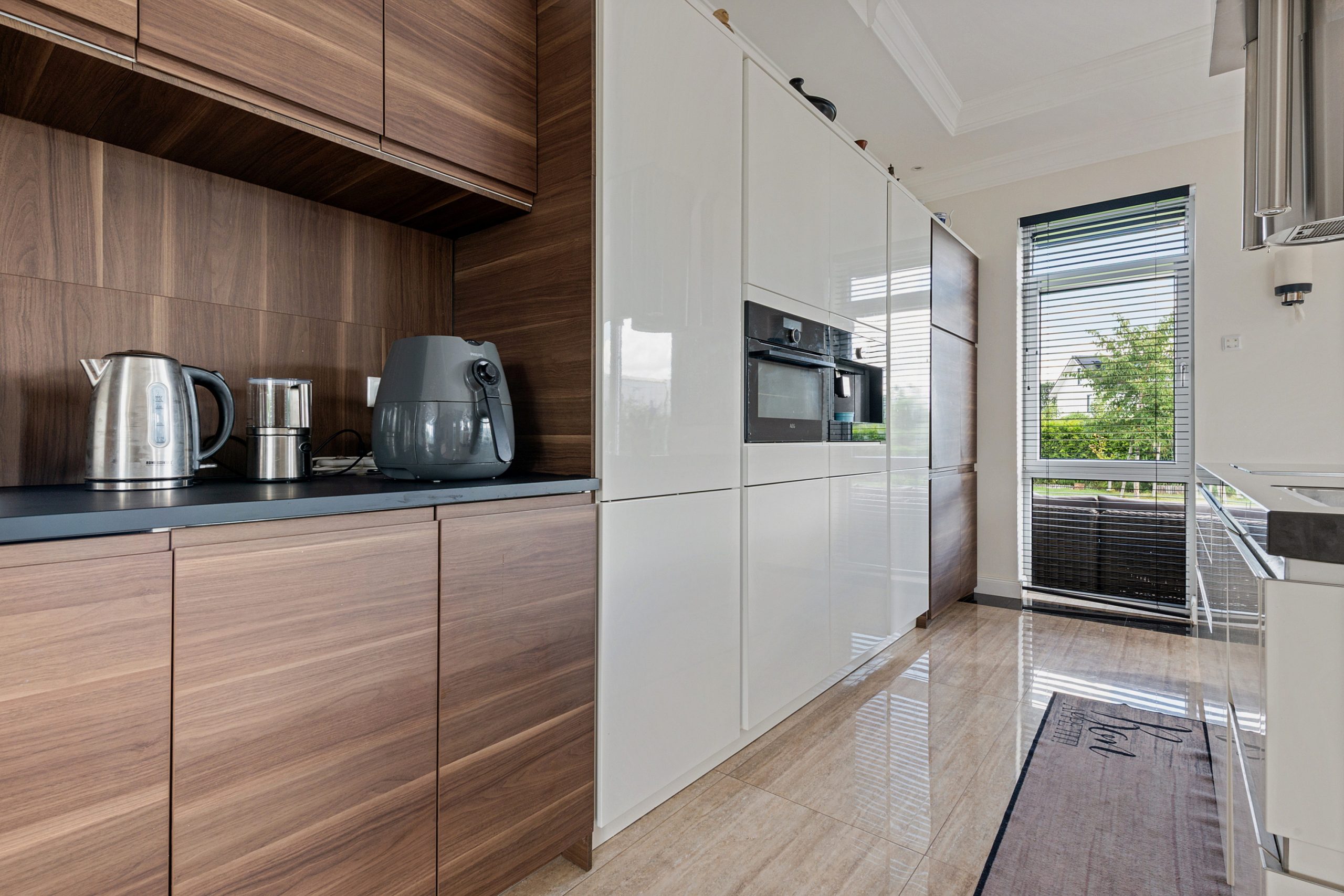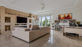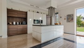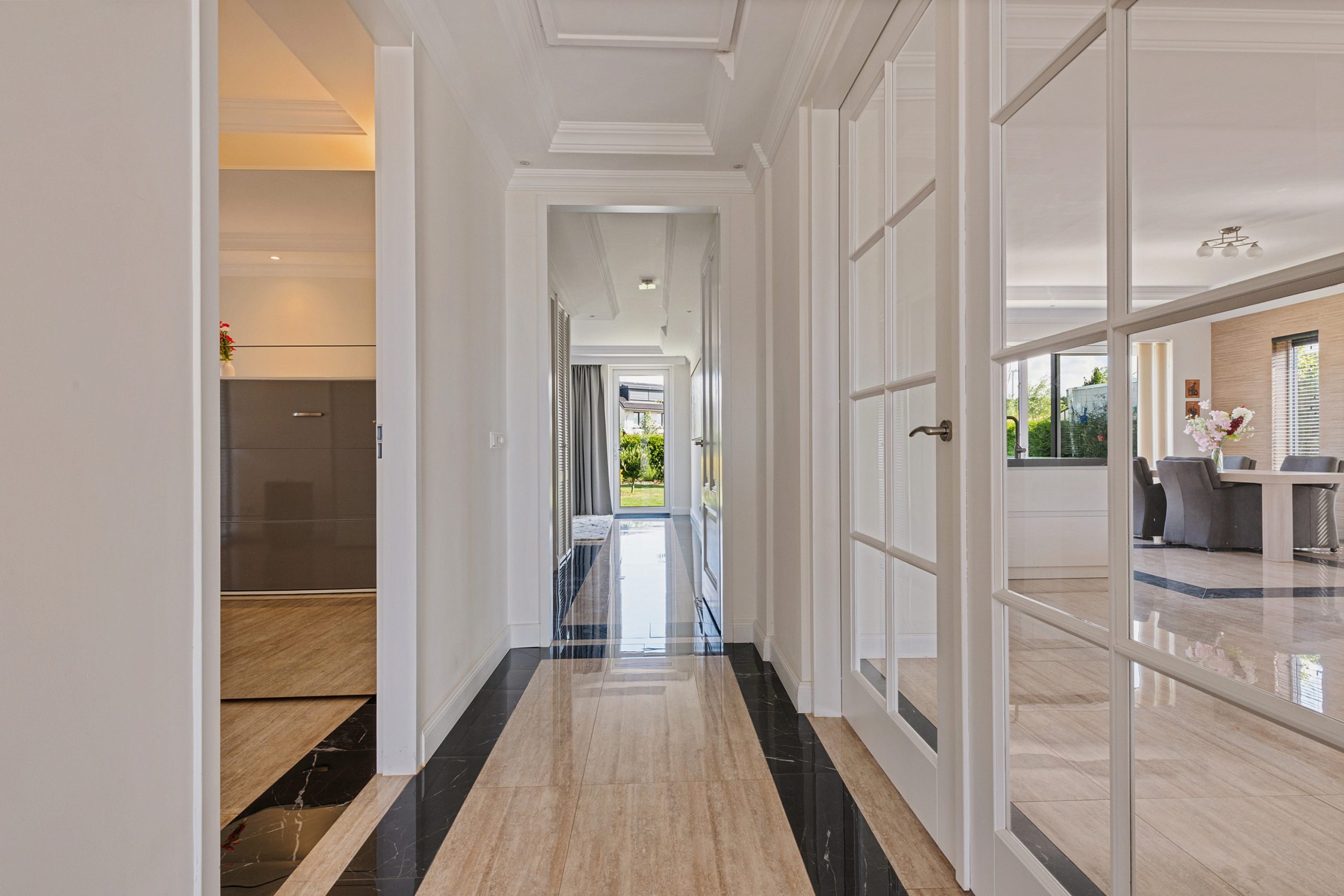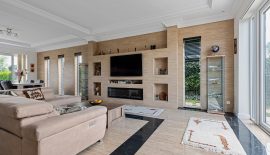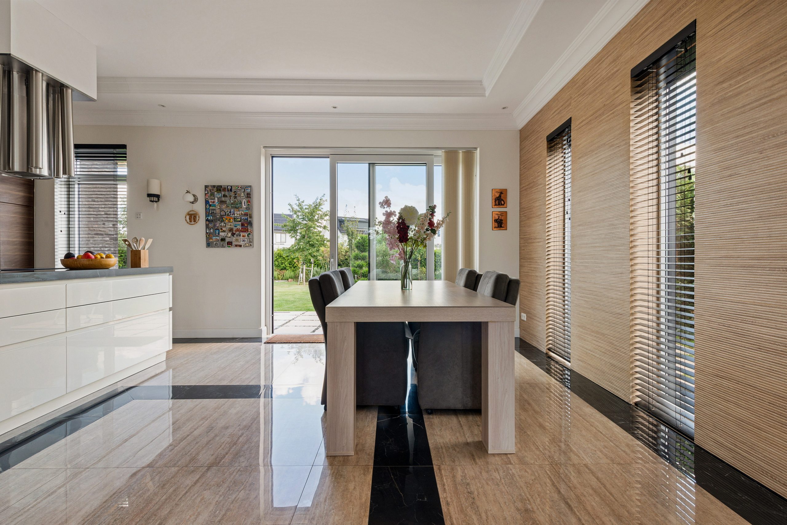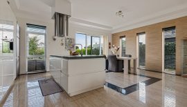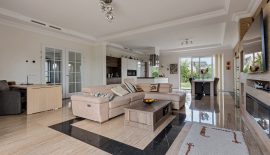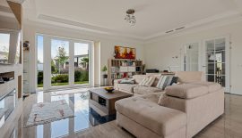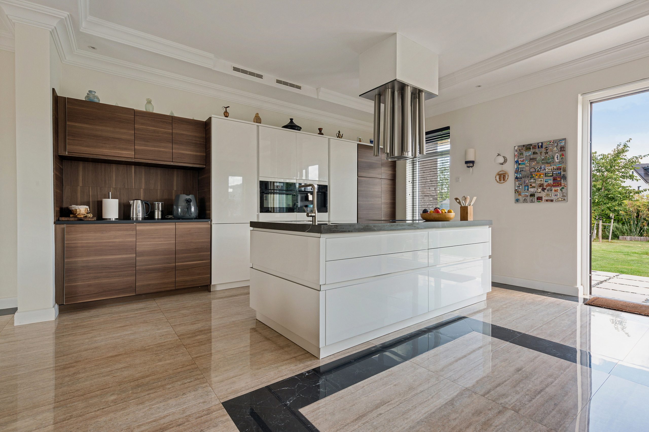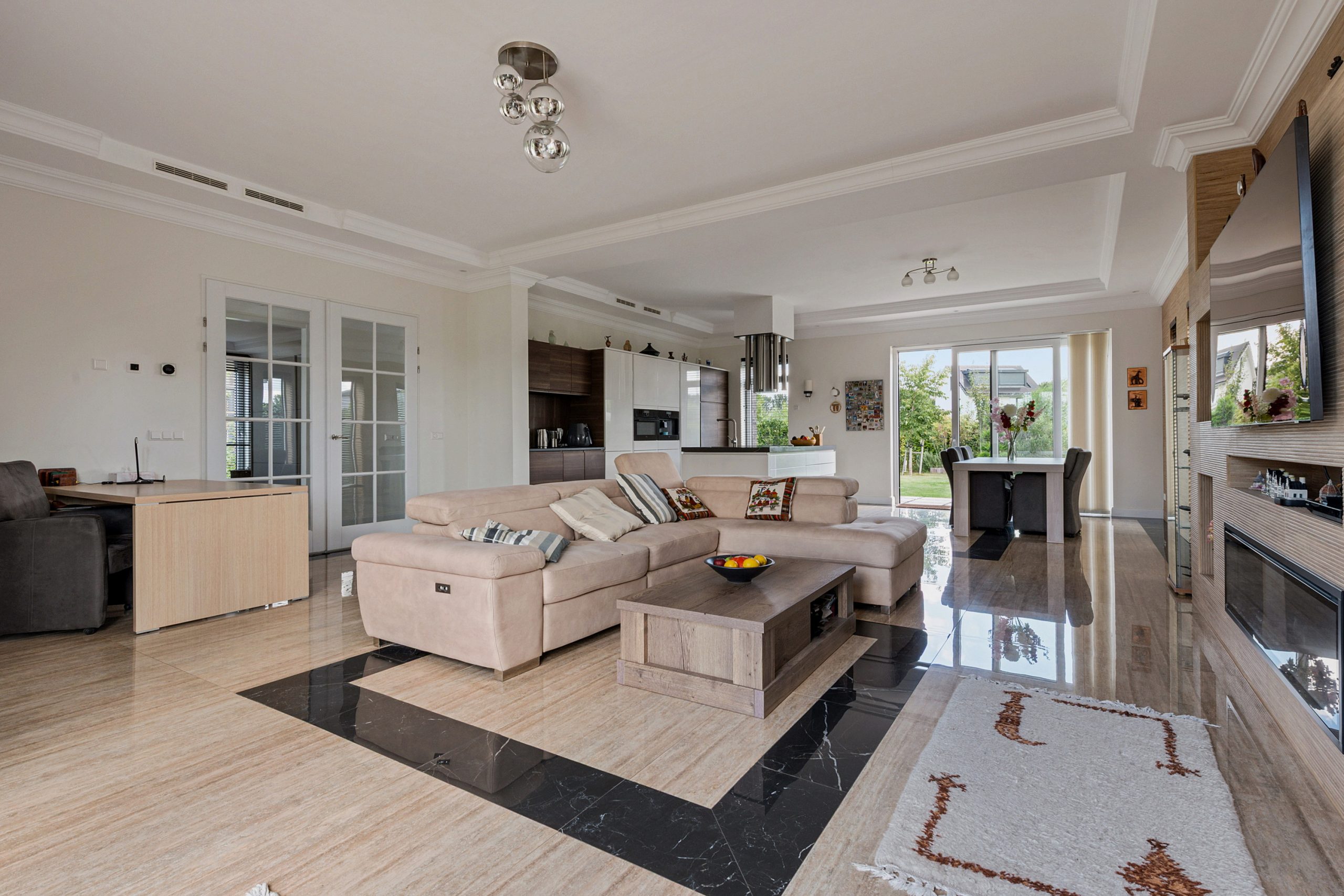 Diepe voortuin met parkeergelegenheid en entree. Ruime hal met paneeldeuren en een luxe hangend toilet. Dubbele deuren geven toegang tot de prachtige zitkamer aan de voorzijde van de woning. Deze doet vriendelijk aan en is voorzien van veel raampartijen, een fraai stuukplafond en een unieke wandafwerking met TV en elektrische haard. Op de vloer liggen exclusieve plavuizen in marmer look en (uiteraard) voorzien van vloerverwarming. De luxe woonkeuken is uitgerust met grote kastenwand en kookeiland. Aan de uitstraling is veel aandacht besteed en de koffiebar geeft een exclusieve indruk. De keuken beschikt verder over een koelkast, vriezer, vaatwasser, oven, koffiemachine en inductie kookplaat. Er is volop ruimte voor een grote eettafel en de schuifpui geeft directe toegang tot de riante achtertuin.