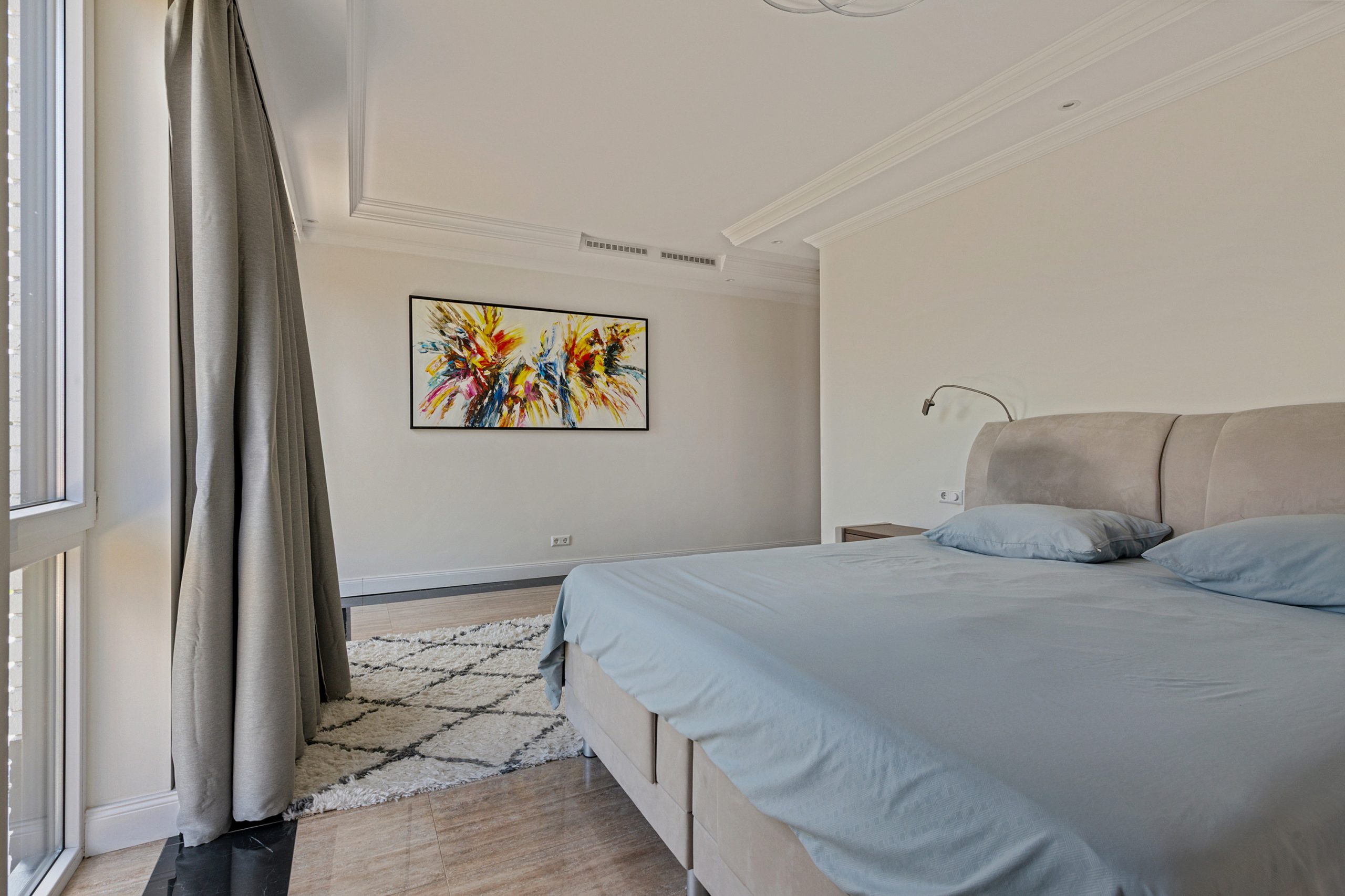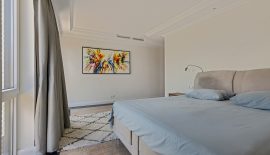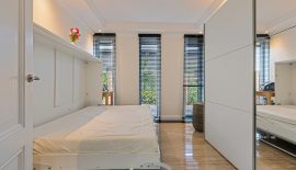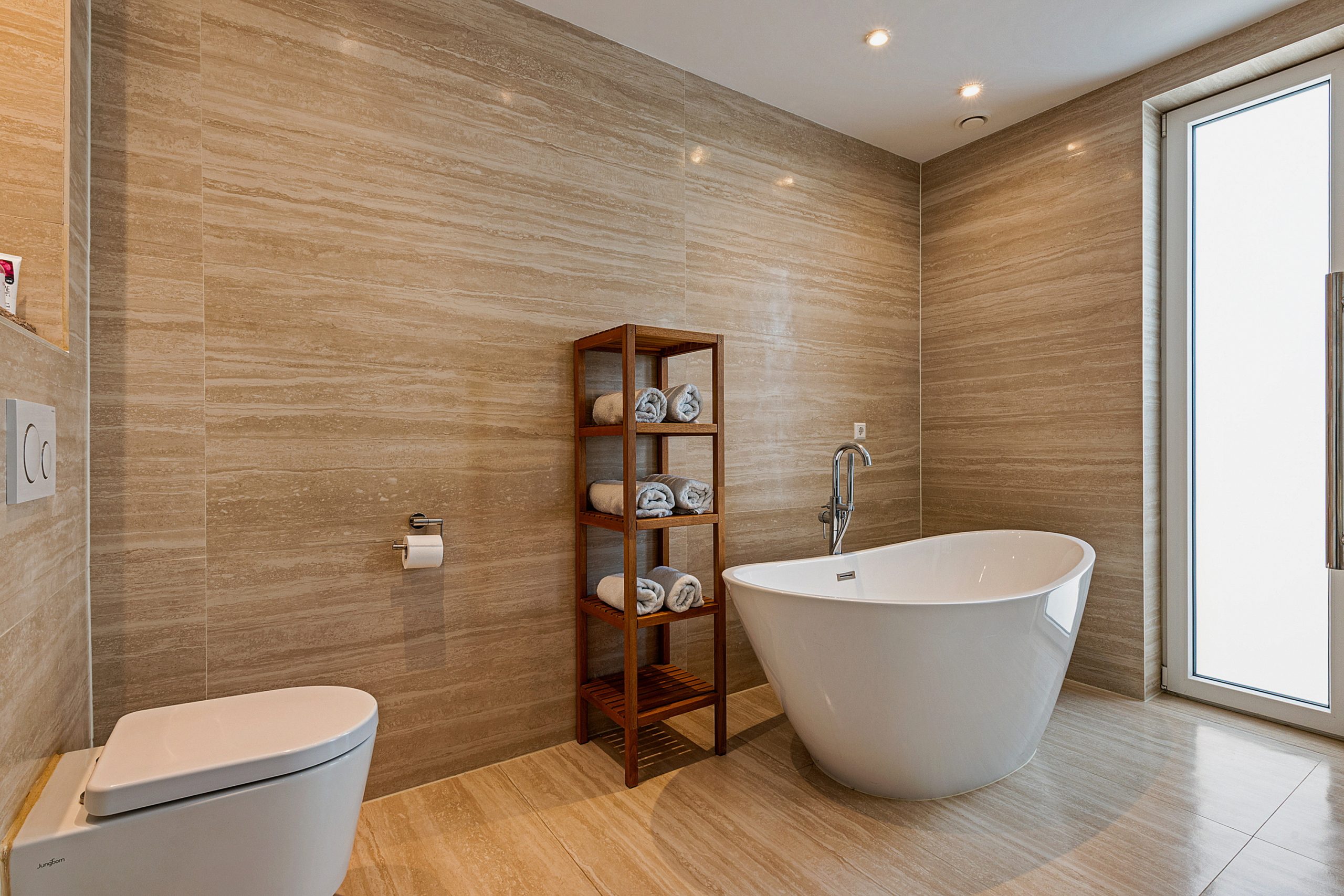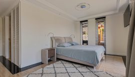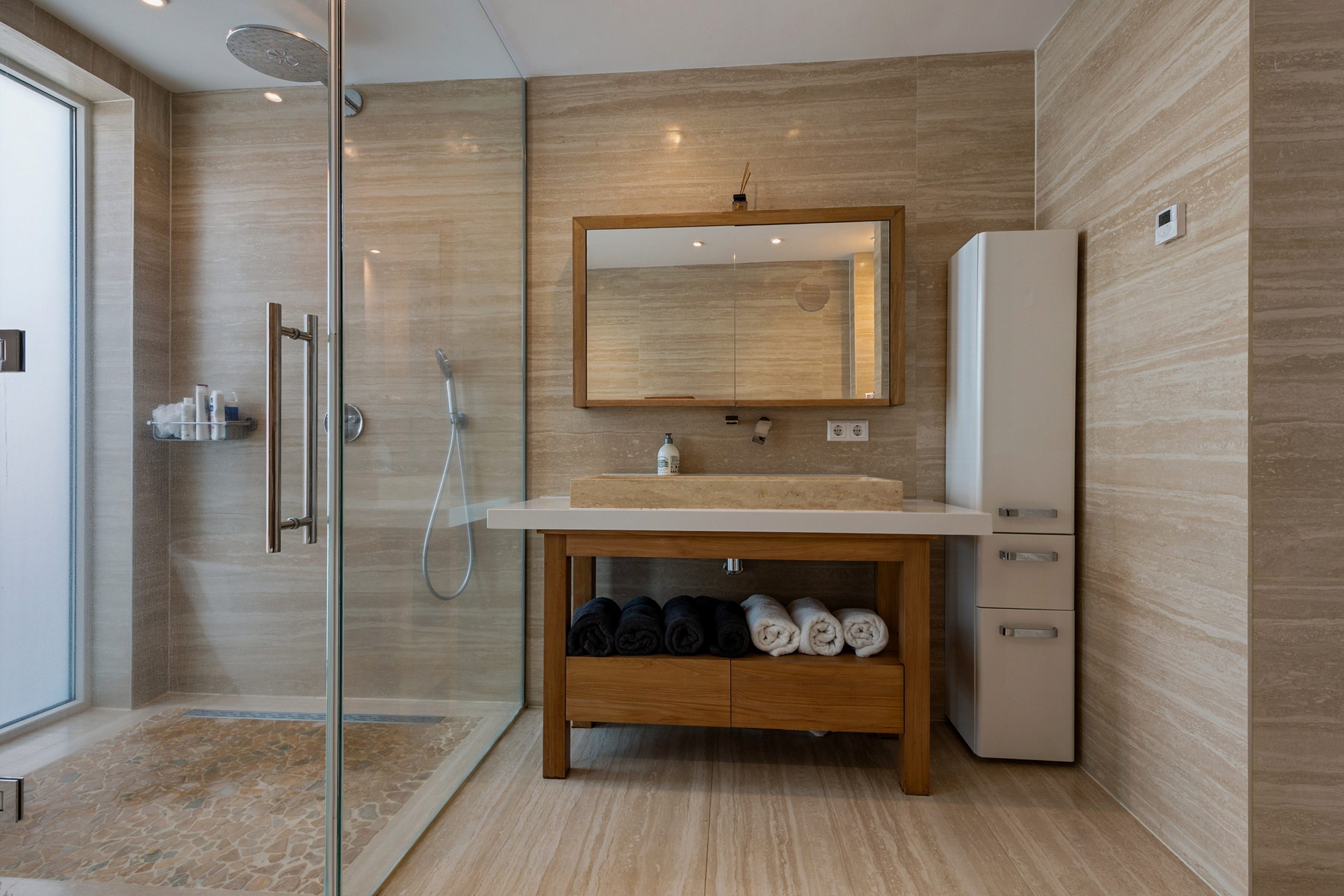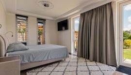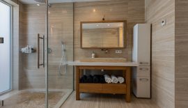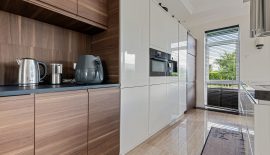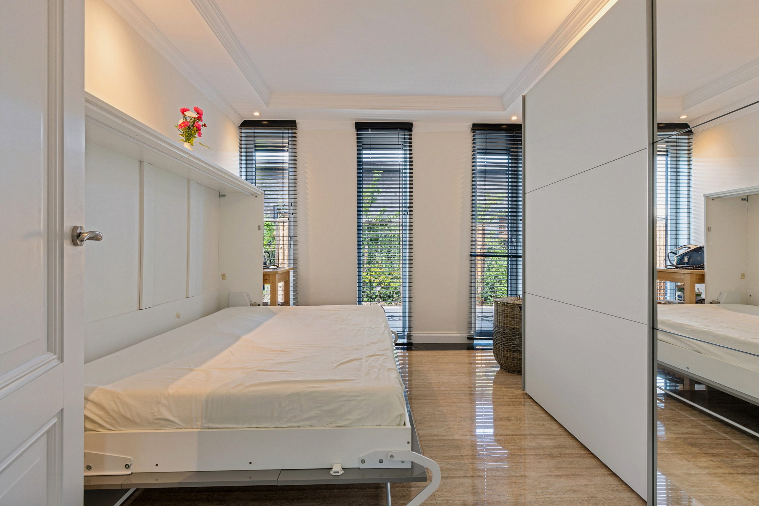 Aan de achterzijde ligt een riante hoofdslaapkamer met tuindeur, vaste kastenwand en een eigen luxe badkamer met inloop-stortdouche, ligbad, dubbele wastafel en hangend toilet. De 2e slaapkamer bevindt zich aan de zijkant en is voorzien van een opklapbaar “hotelbed” en een schuifkast. De 2e luxe badkamer annex wasruimte is uitgerust met een gastendouche, wastafelmeubel, was- en droogaansluiting en een uitstortgootsteen. Aan de voorzijde ligt een bijkeuken met kastenwand waarin de opstelling van technische apparatuur zich bevindt, zoals de ‘Daikin’ warmtepomp, boiler, omvormer en mechanische ventilatie. De bijkeuken is ook direct van buitenaf bereikbaar.