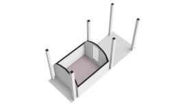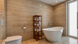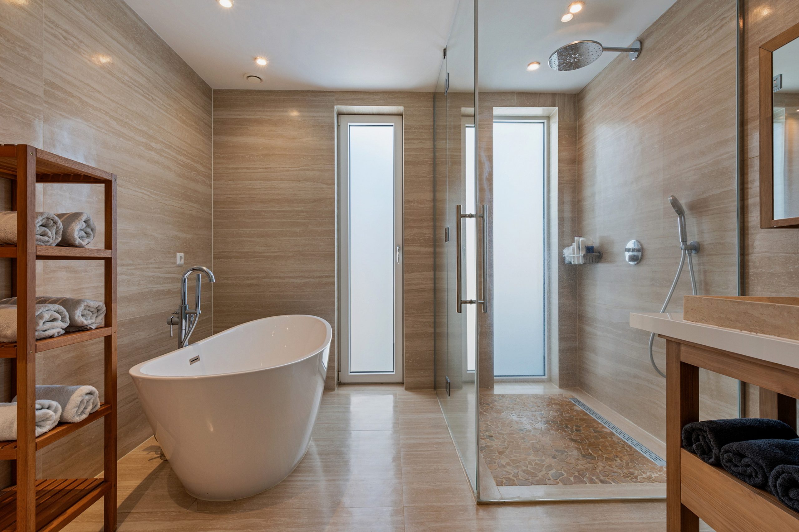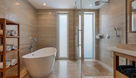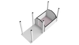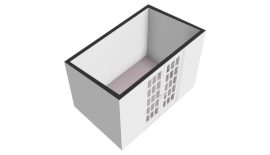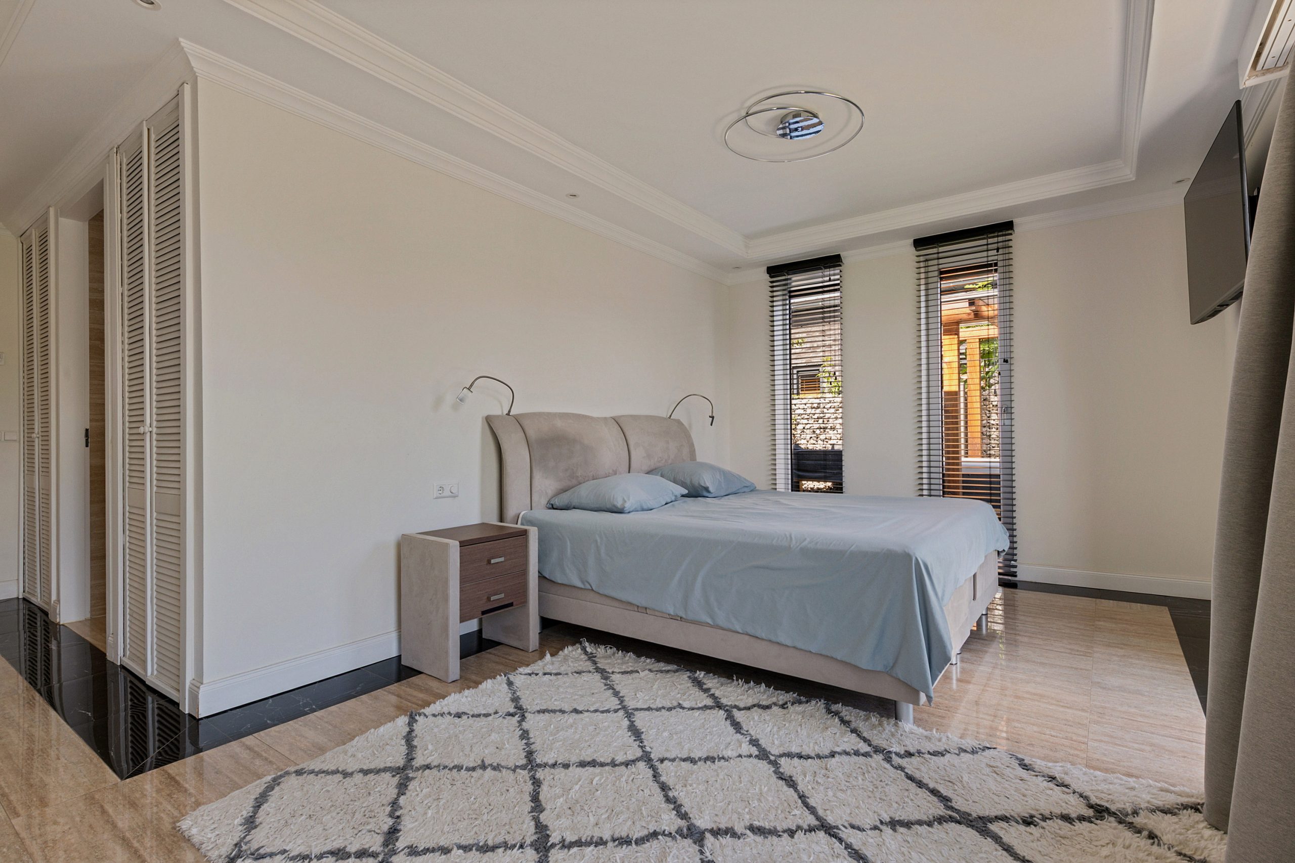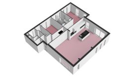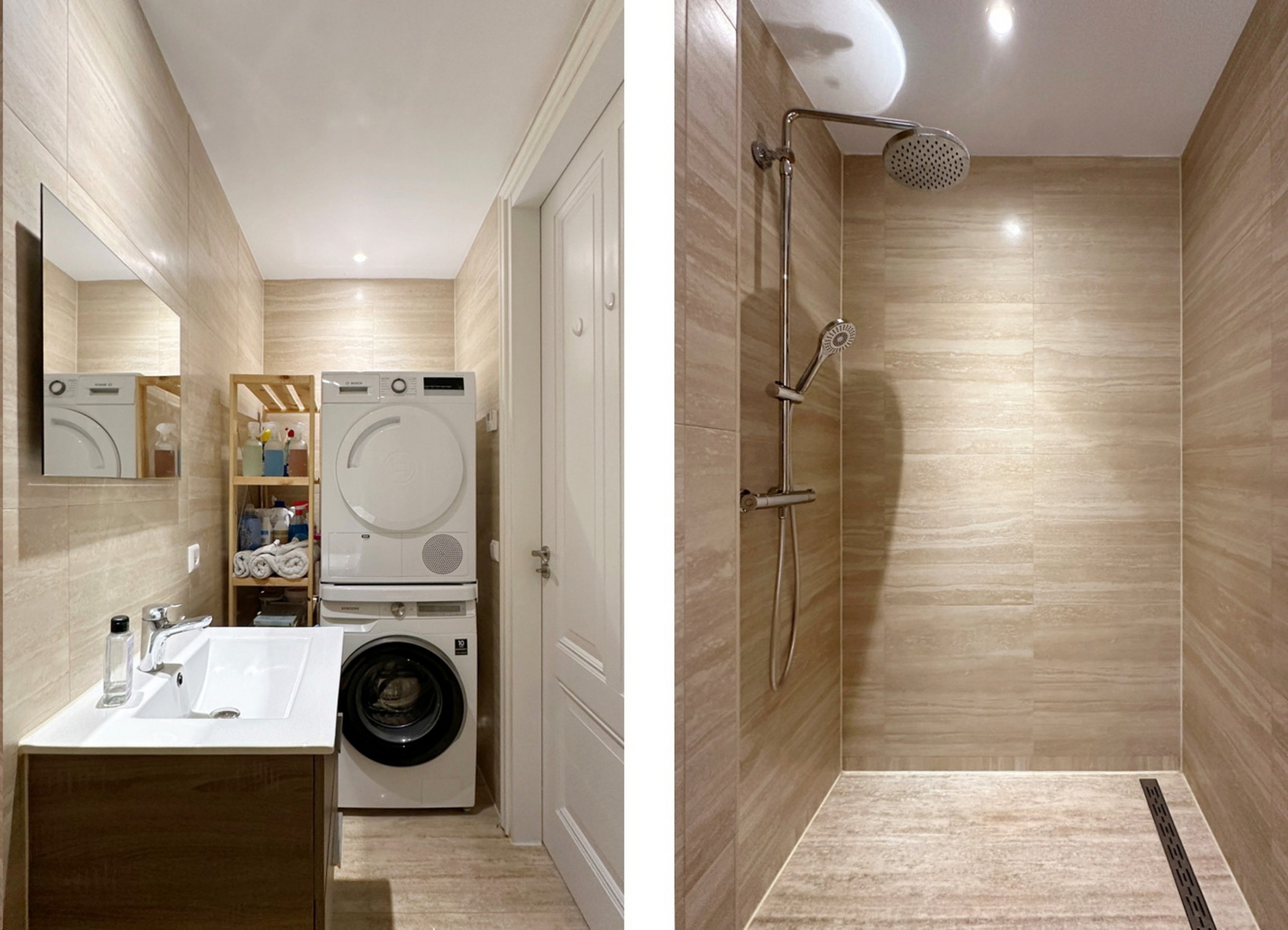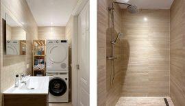 Aan de achterzijde ligt een riante hoofdslaapkamer met tuindeur, vaste kastenwand en een eigen luxe badkamer met inloop-stortdouche, ligbad, dubbele wastafel en hangend toilet. De 2e slaapkamer bevindt zich aan de zijkant en is voorzien van een opklapbaar “hotelbed” en een schuifkast. De 2e luxe badkamer annex wasruimte is uitgerust met een gastendouche, wastafelmeubel, was- en droogaansluiting en een uitstortgootsteen. Aan de voorzijde ligt een bijkeuken met kastenwand waarin de opstelling van technische apparatuur zich bevindt, zoals de ‘Daikin’ warmtepomp, boiler, omvormer en mechanische ventilatie. De bijkeuken is ook direct van buitenaf bereikbaar.