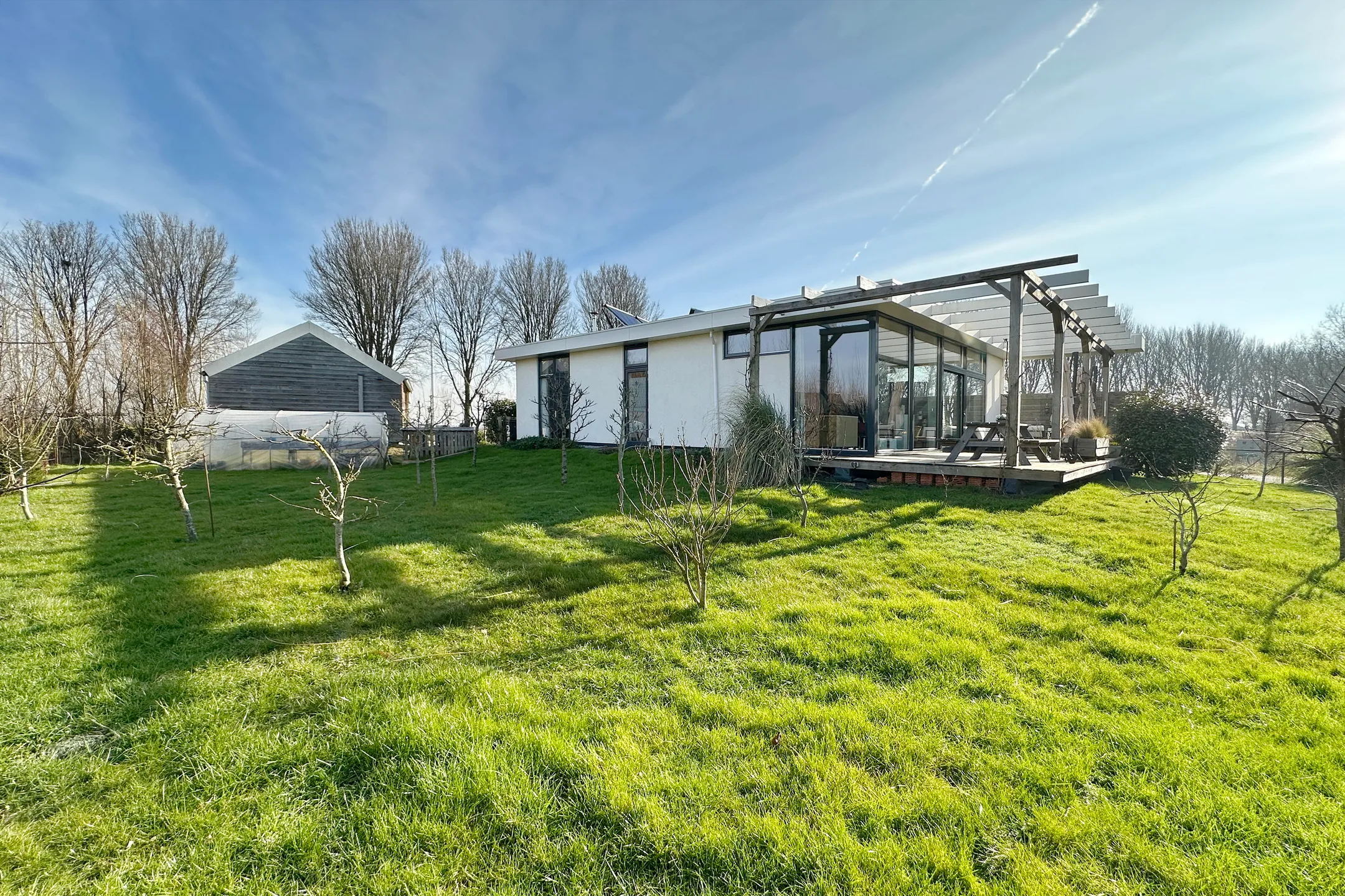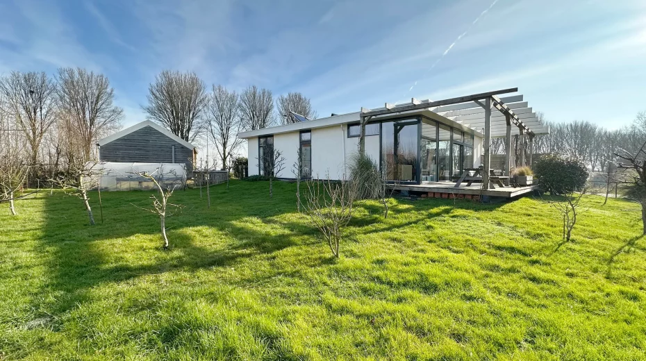 Wonen in Oosterwold is iets bijzonders: bouwen op zeer royale kavels, naar eigen inzicht, zonder welstand en zoveel mogelijk zelfvoorzienend en op en top duurzaam. Zo is ook op de hoek met de ‘Paradijsvogelweg’ deze speelse, doordachte en duurzame bungalow ontworpen en gebouwd in 2018 /2019, maximaal profiterend van het licht en het uitzicht op de weide omgeving. Een comfortabel huis van 129 m2 voor twee personen of een klein gezin. Aangevuld met een vrijstaand geïsoleerd guesthouse van bijna 37 m2, waar uitwonende kinderen kunnen logeren; of waar u kantoor / praktijk aan huis kunt houden of zoals in dit geval, een fraai atelier kunt inrichten. Naast het atelier ligt nog een grote houten schuur van bijna 20 m2, die eventueel ook eenvoudig is aan te passen tot garage.
