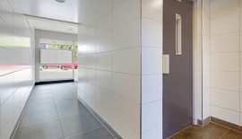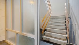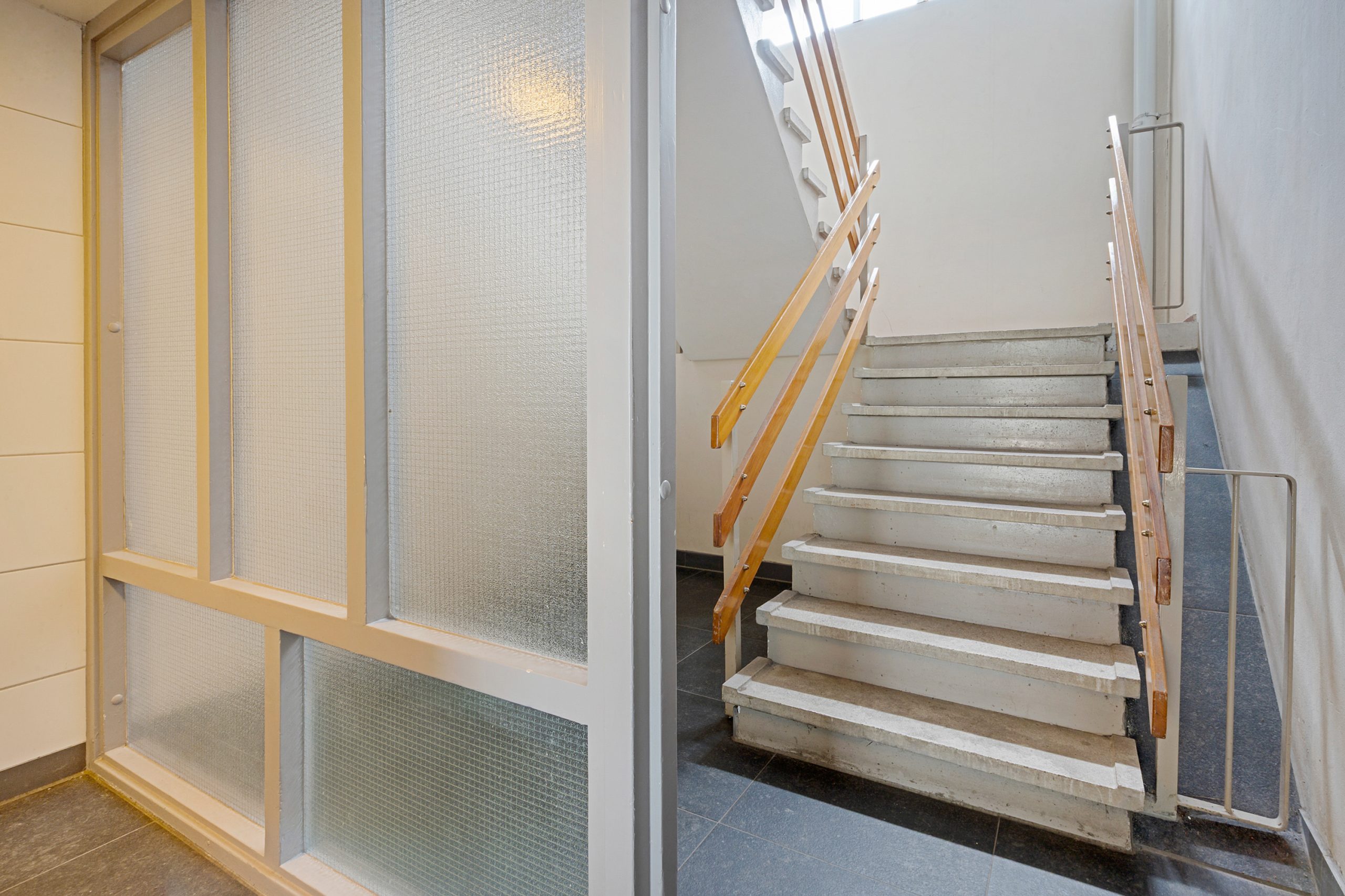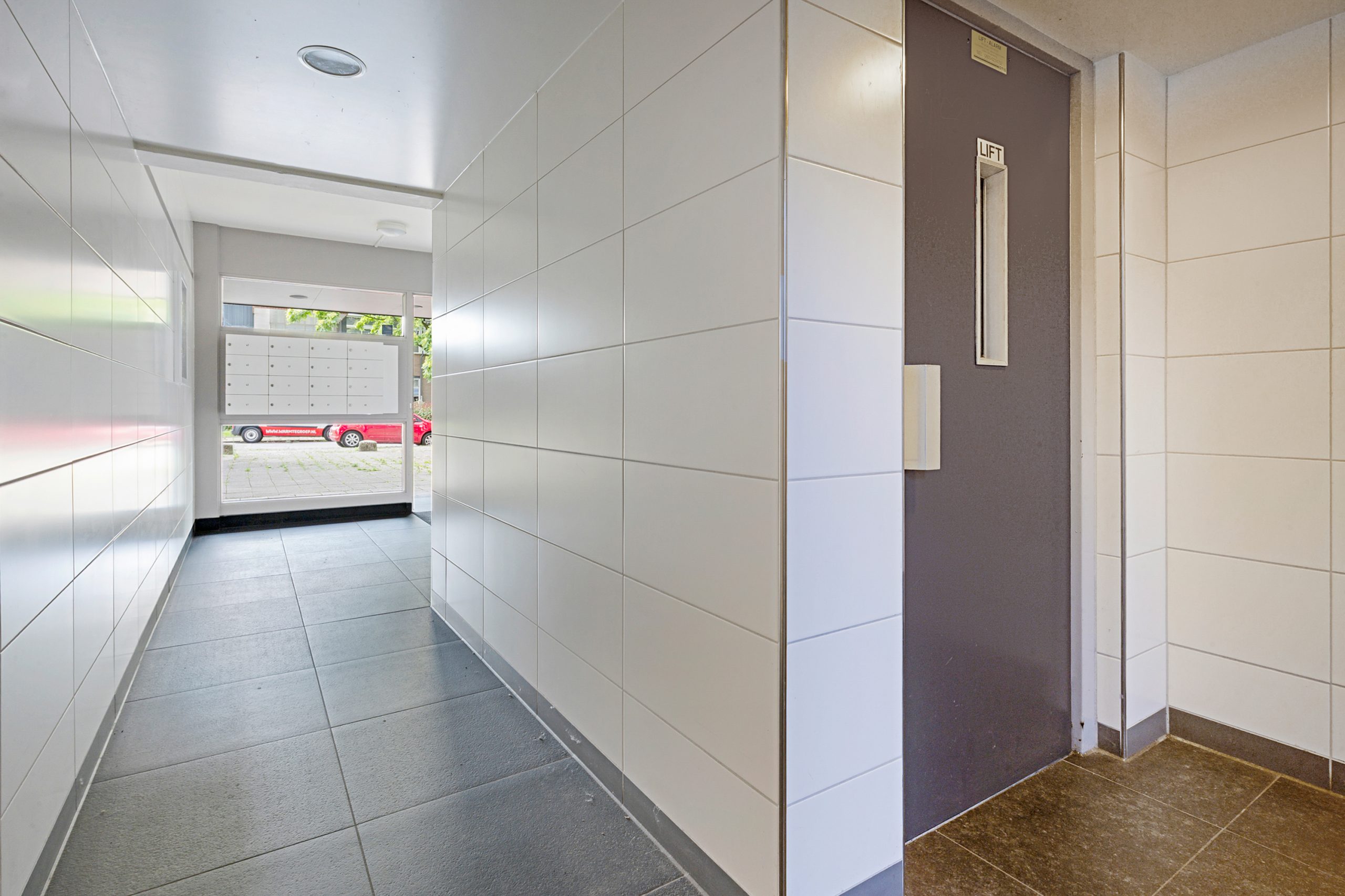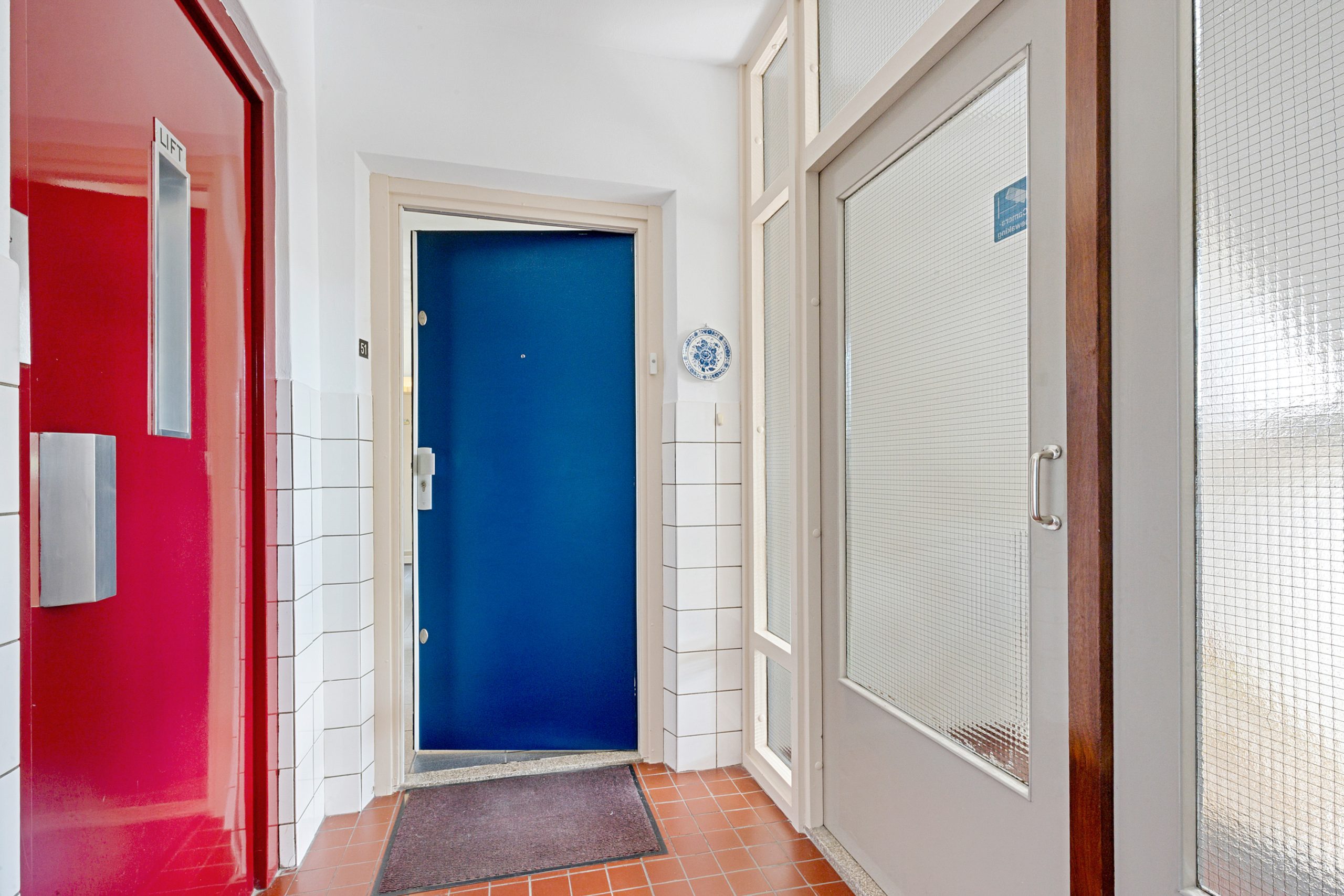 Vernieuwde entree met bellentableau en de brievenbussen. Via de lift of het trappenhuis zijn de hoger gelegen appartementen bereikbaar.