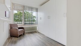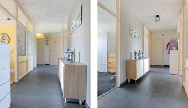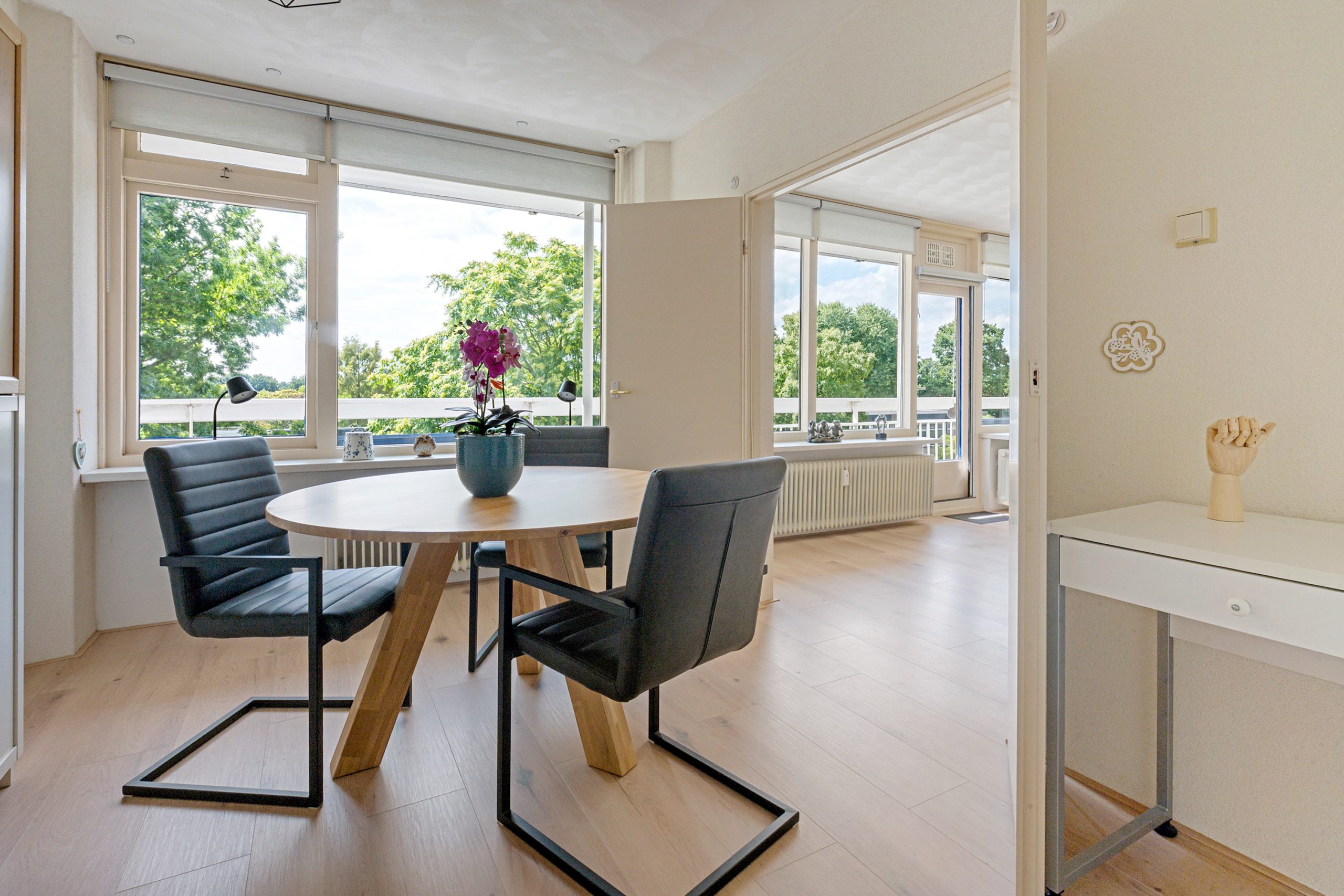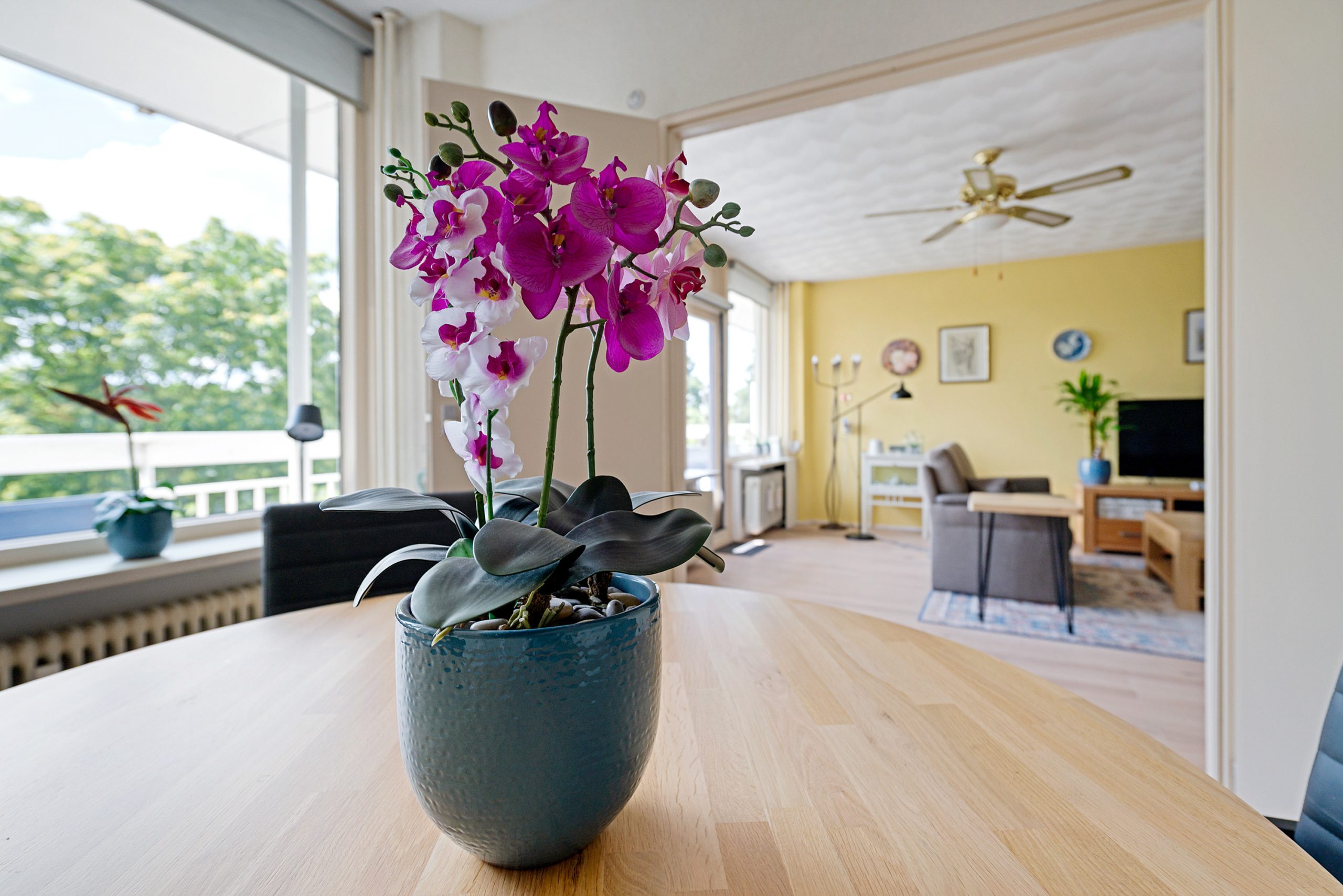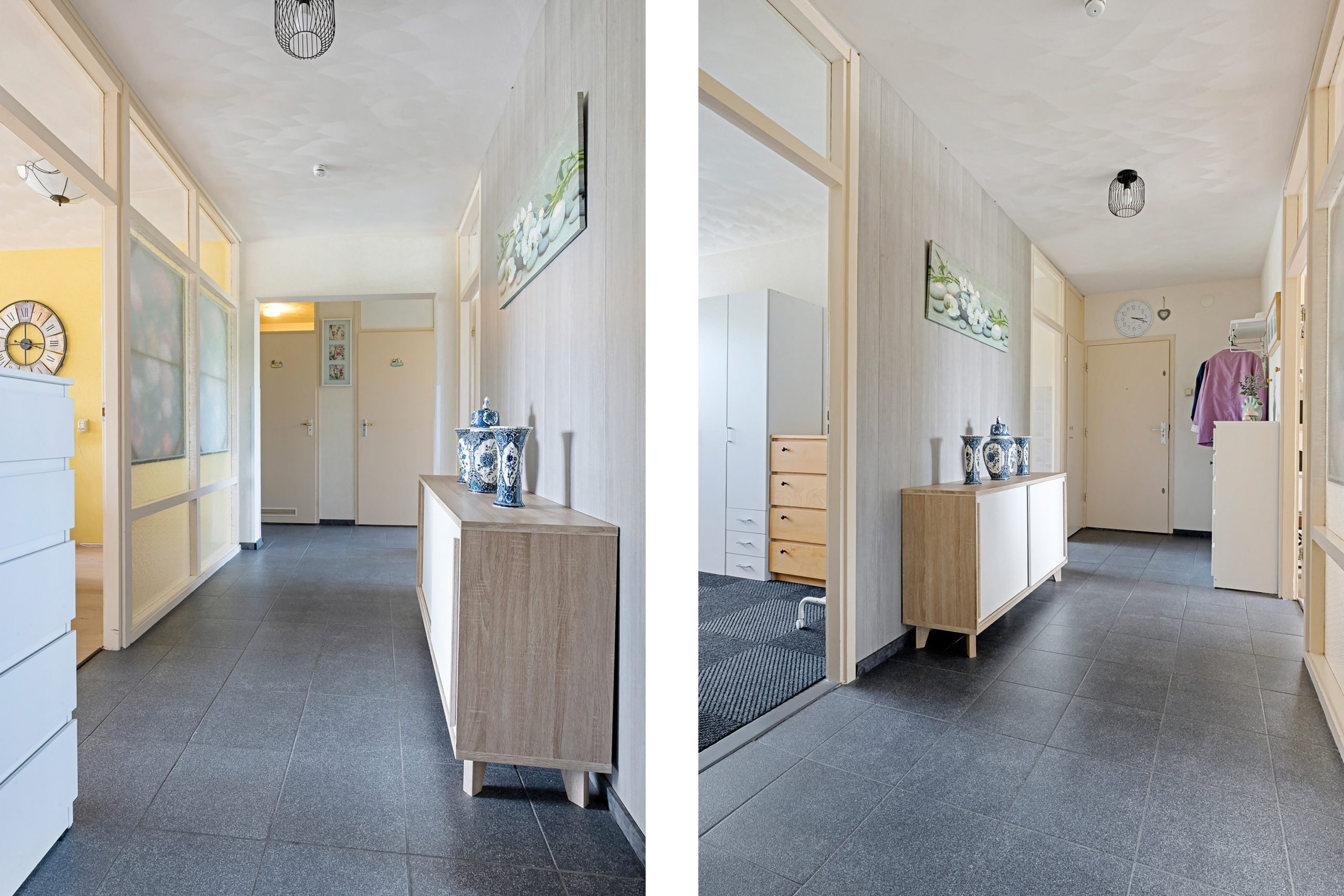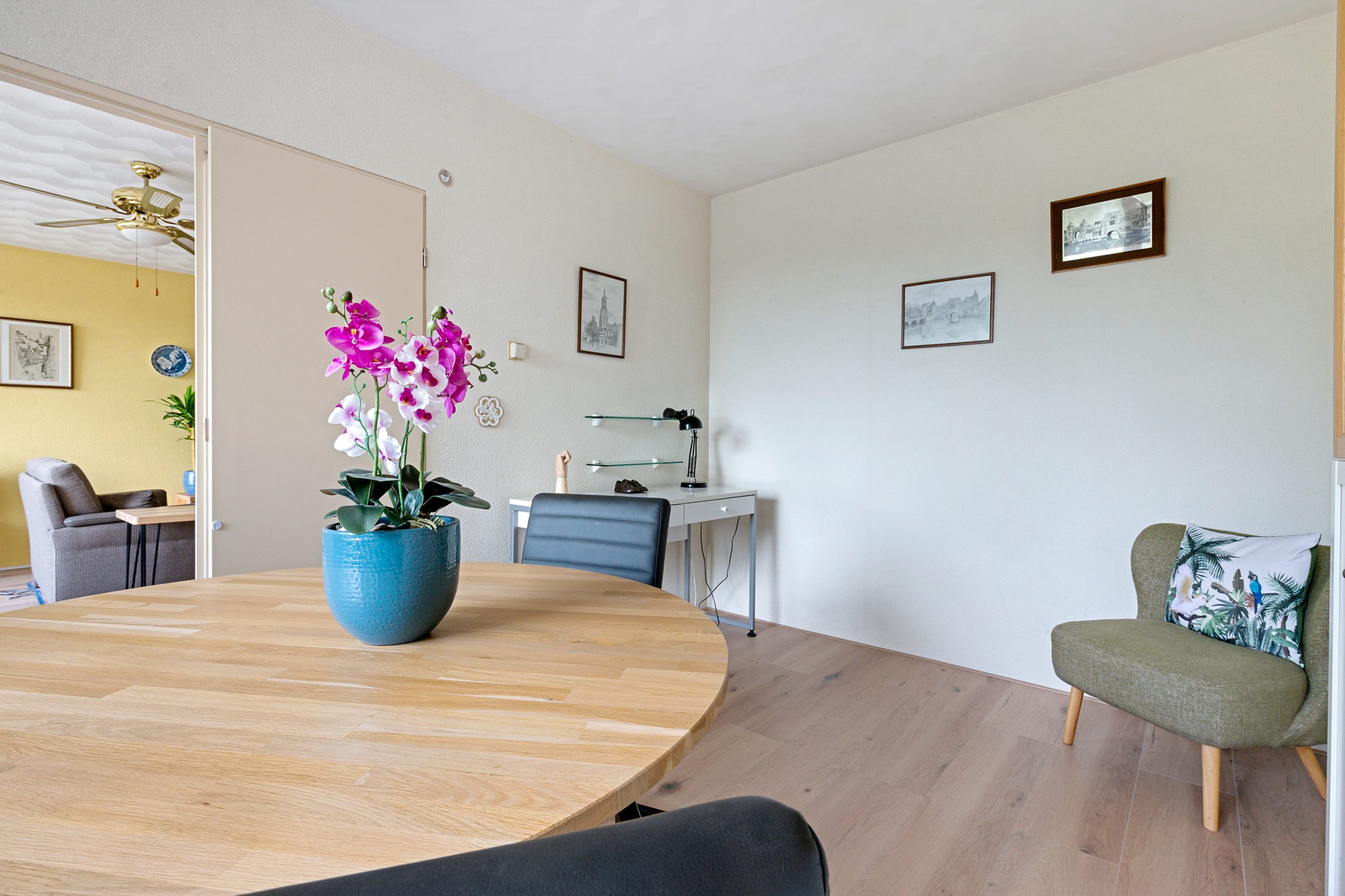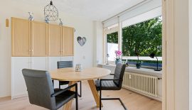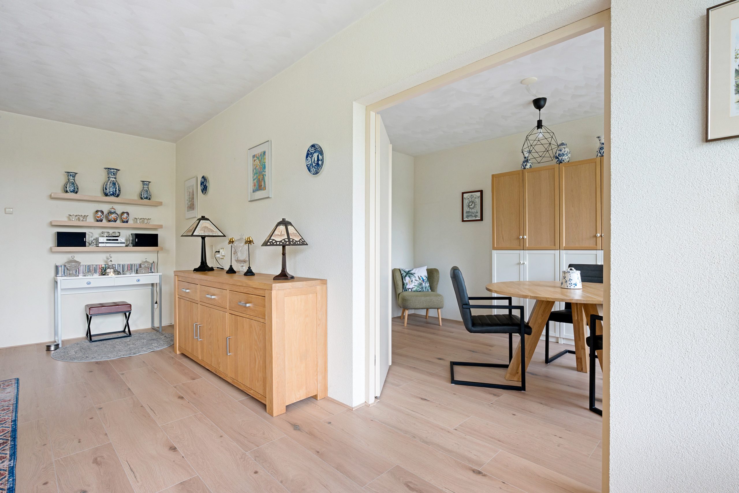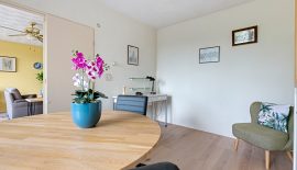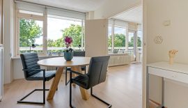 Entree, ruime L-vormige hal met videofoon, vernieuwde meterkast en glaswand met ruitjes deur. Ruime lichte woonkamer (30 m2) met ramen over de volle breedte en toegang tot het extra brede balkon. Dit balkon is voorzien van vlonders en heeft een fijne zon ligging op het westen, waardoor het mogelijk is om de gehele middag en avond te genieten van de zon. Naast de woonkamer ligt een grote zijkamer van 13 m2 met dubbele deuren, welke nu als eetkamer is ingericht, maar ook als slaap- of werkkamer gebruikt kan worden. De gehele woonkamer en zijkamer zijn in 2023 voorzien van eiken laminaatvloer met ‘whitewash’ effect, hierdoor ogen deze ruimtes extra ruim & licht.