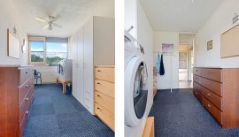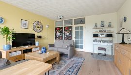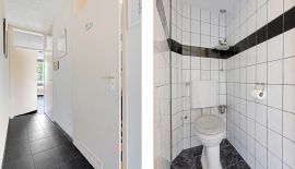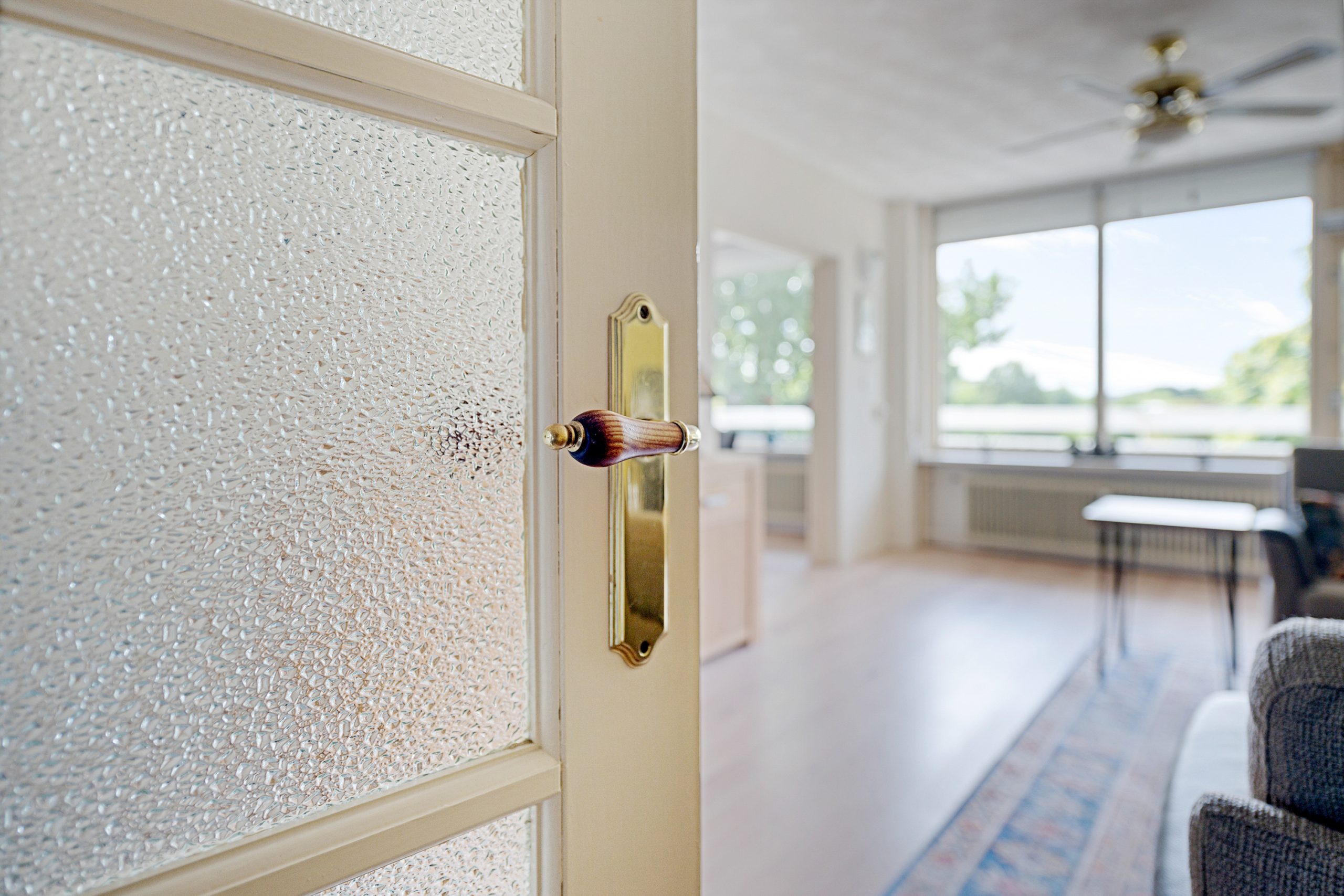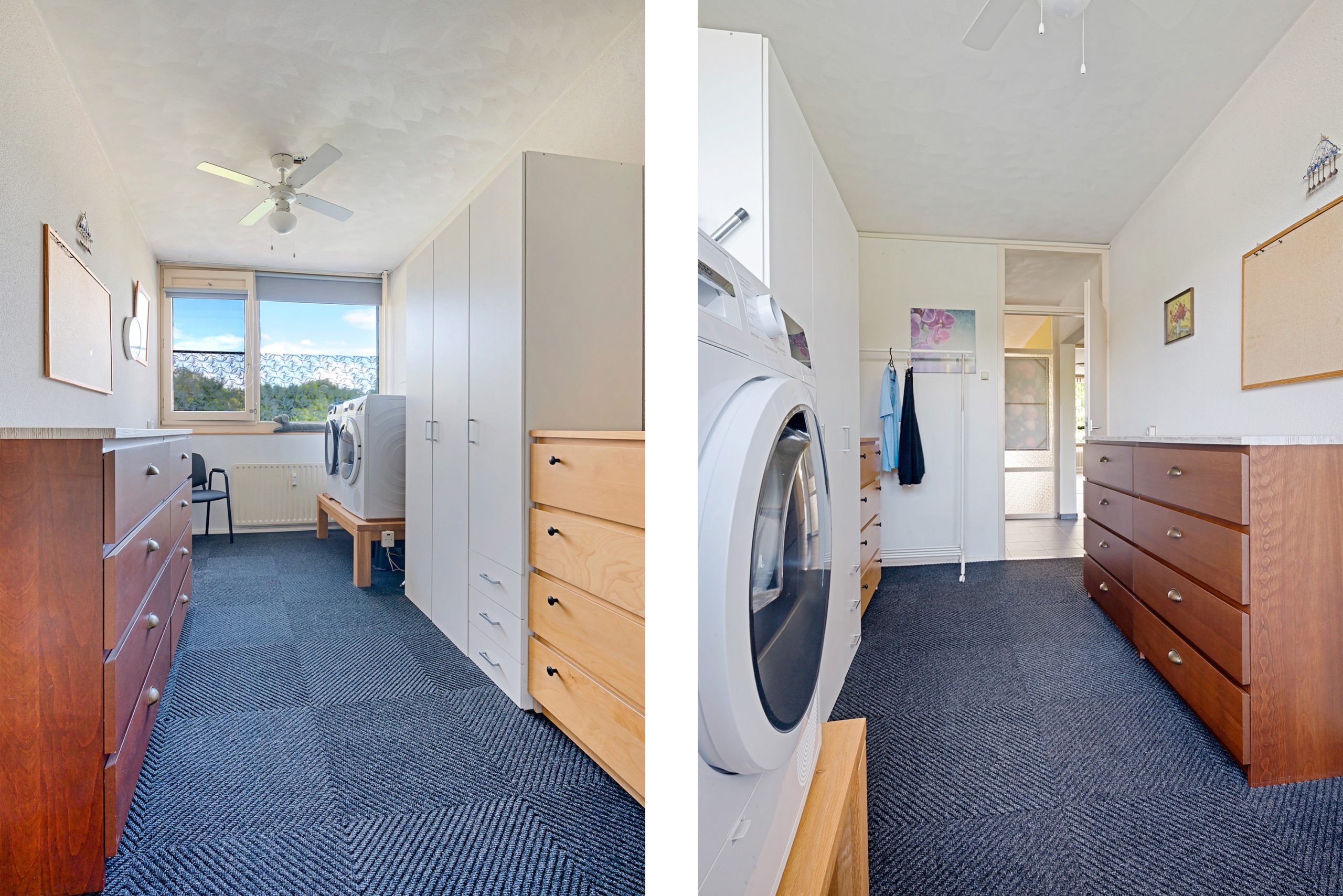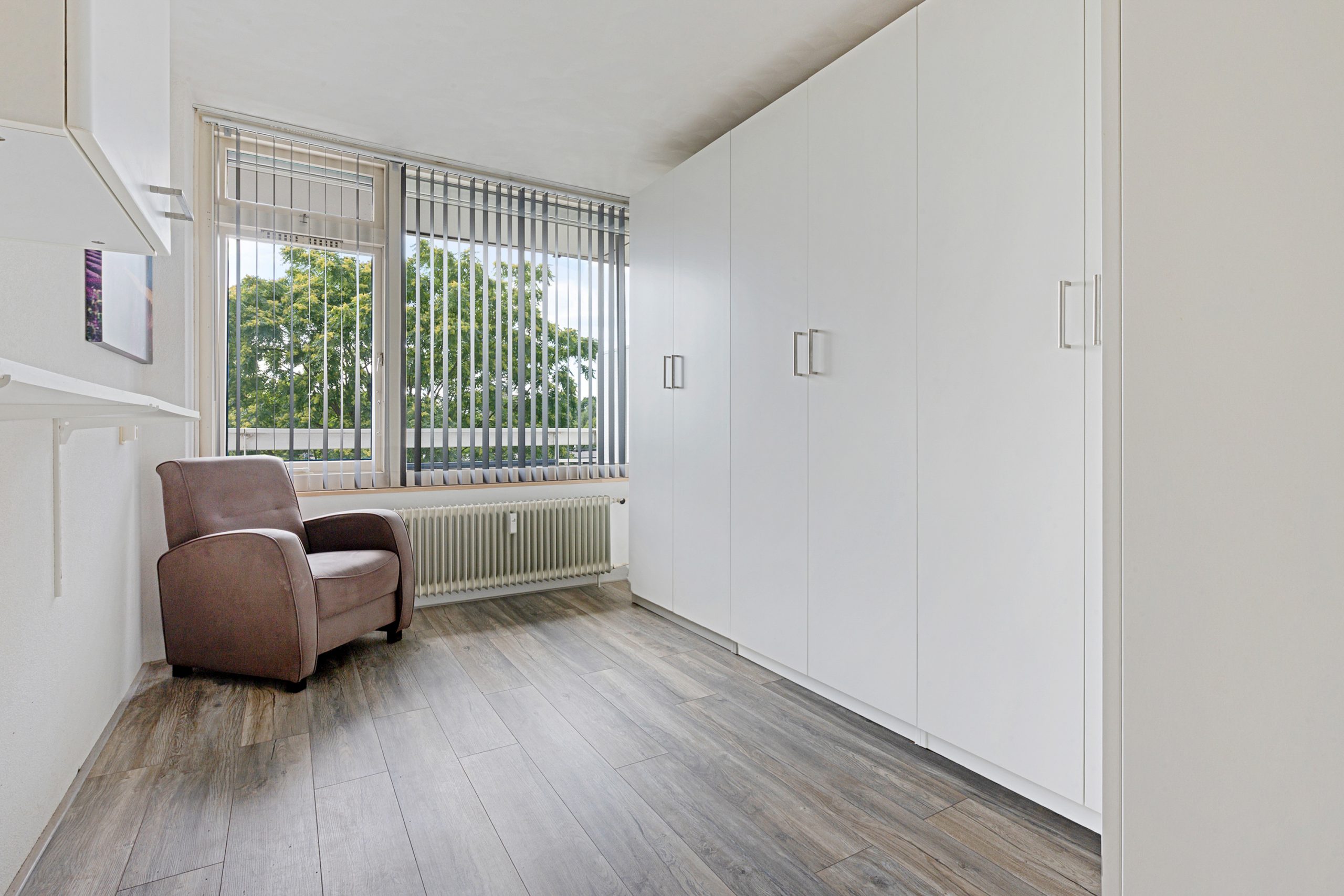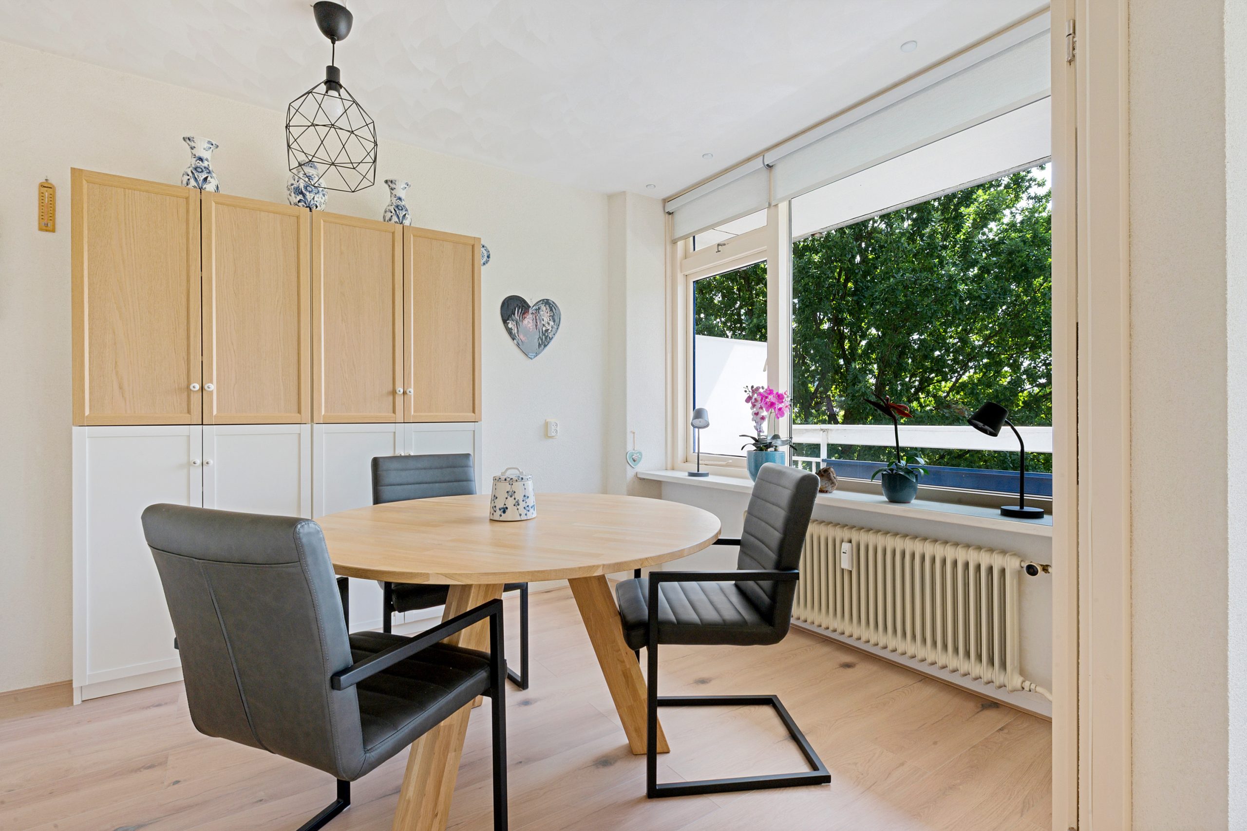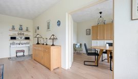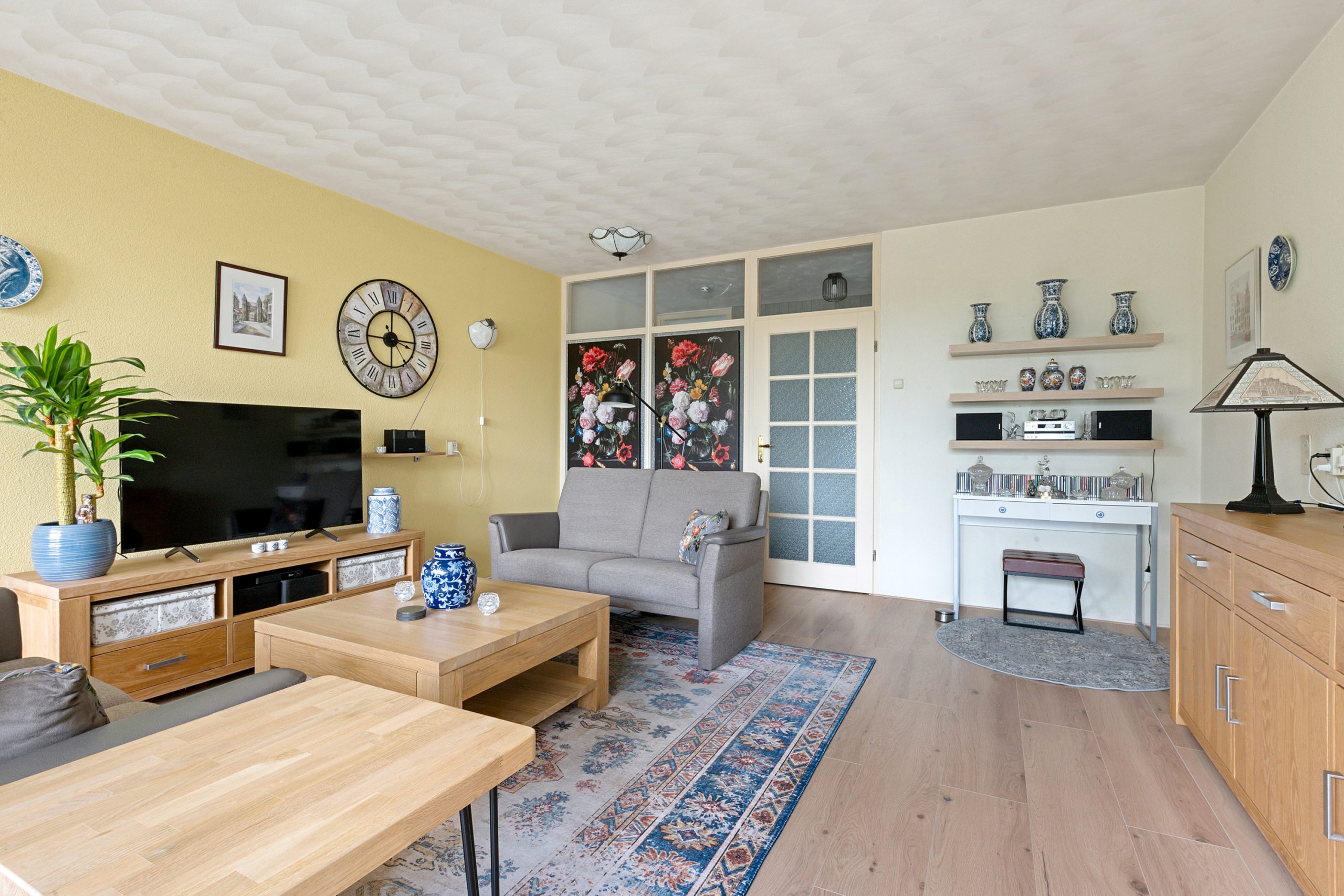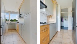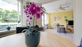 Entree, ruime L-vormige hal met videofoon, vernieuwde meterkast en glaswand met ruitjes deur. Ruime lichte woonkamer (30 m2) met ramen over de volle breedte en toegang tot het extra brede balkon. Dit balkon is voorzien van vlonders en heeft een fijne zon ligging op het westen, waardoor het mogelijk is om de gehele middag en avond te genieten van de zon. Naast de woonkamer ligt een grote zijkamer van 13 m2 met dubbele deuren, welke nu als eetkamer is ingericht, maar ook als slaap- of werkkamer gebruikt kan worden. De gehele woonkamer en zijkamer zijn in 2023 voorzien van eiken laminaatvloer met ‘whitewash’ effect, hierdoor ogen deze ruimtes extra ruim & licht.