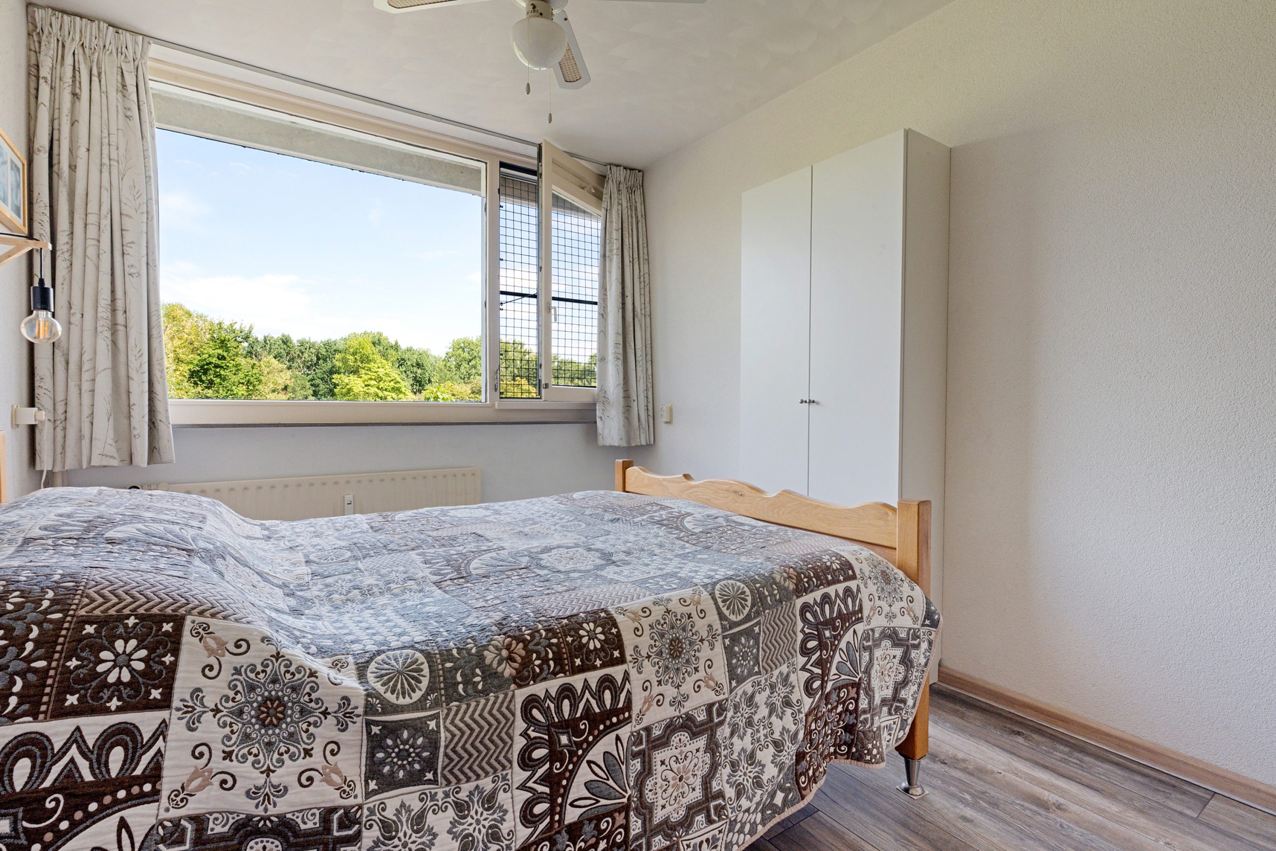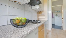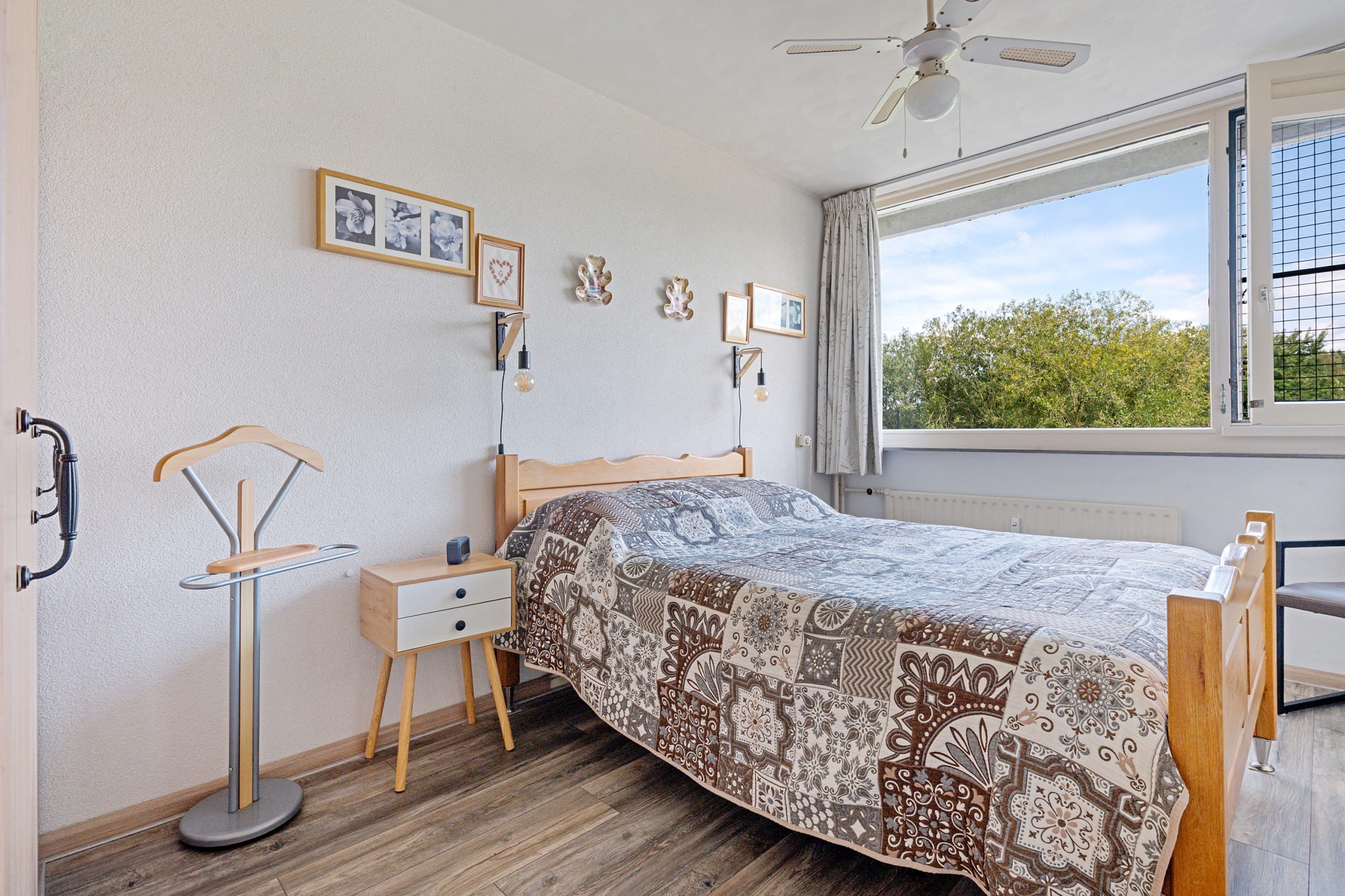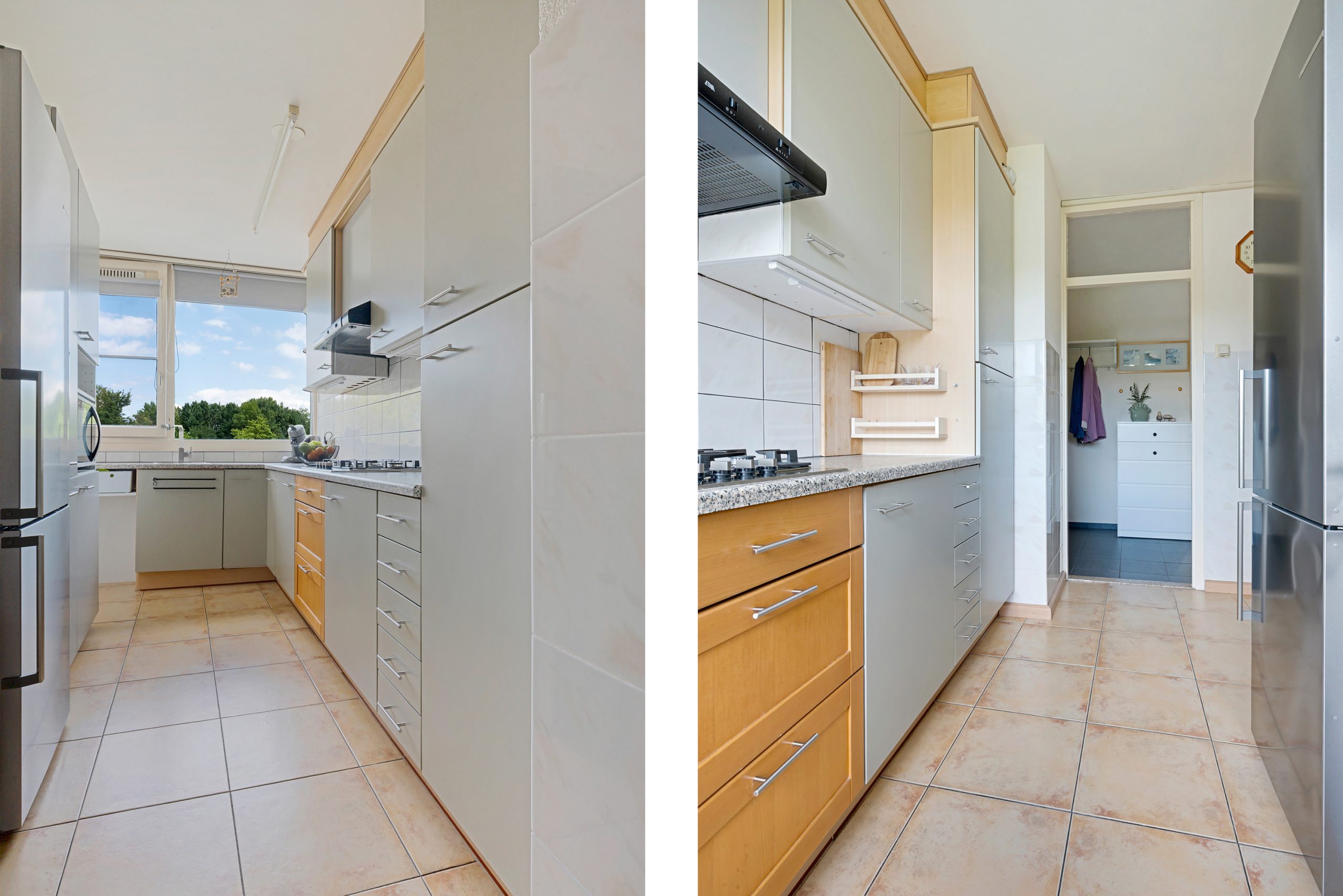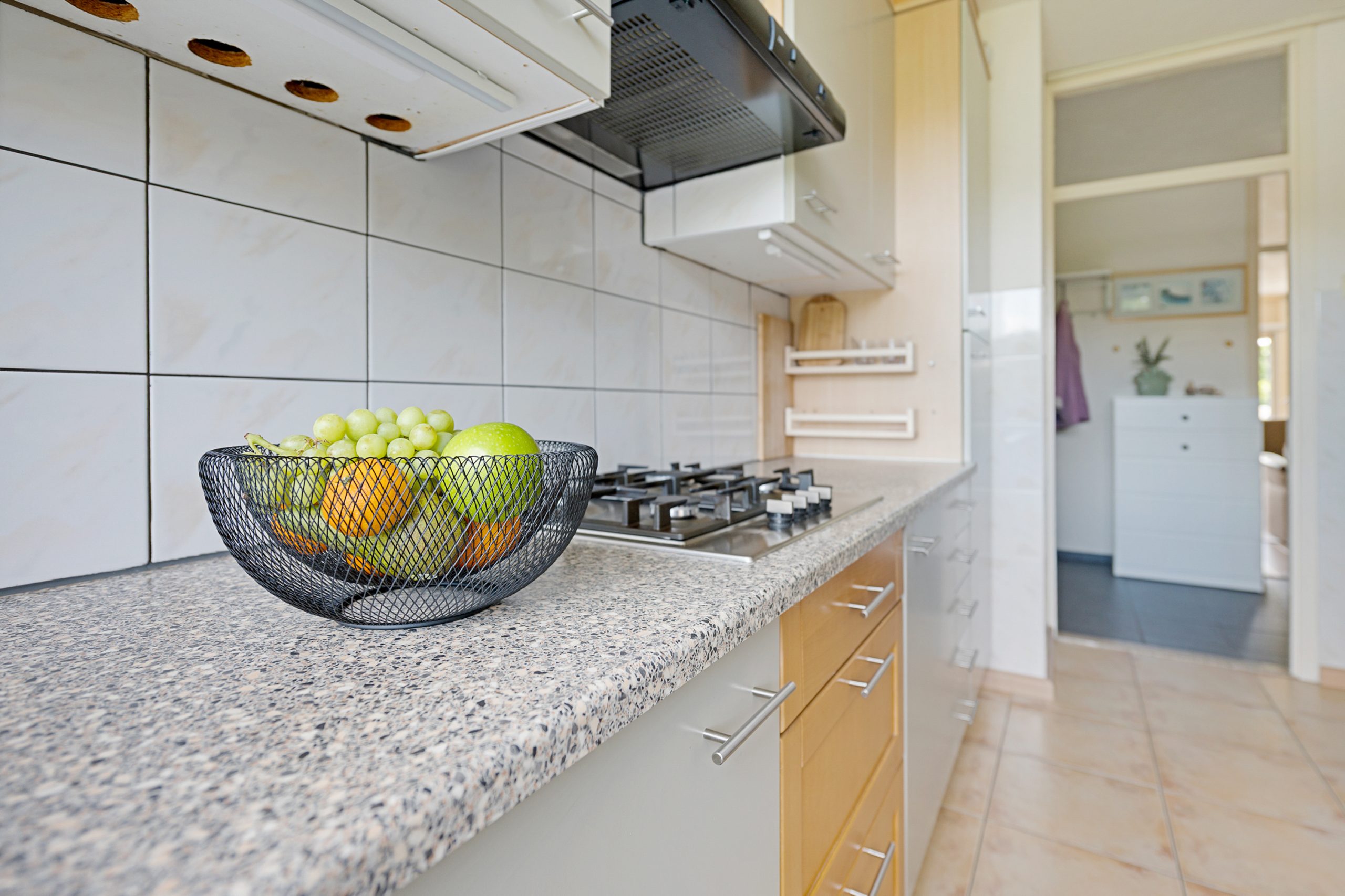 Aan de achtterzijde ligt een nette dichte keuken in L-opstelling met veel kastruimte, 4-pits gasstel, afzuigkap, wasmachine aansluiting, de losse koel-/vrieskast (deze gaat mee). Vanuit de keuken heb je prachtig uitzicht op het achtergelegen groen van het Waterwingebied.